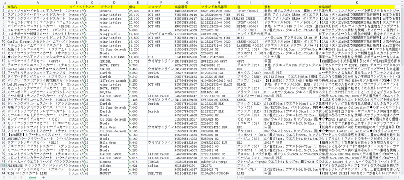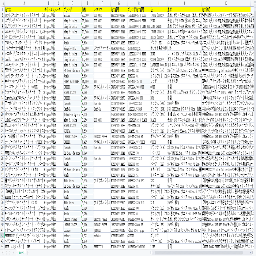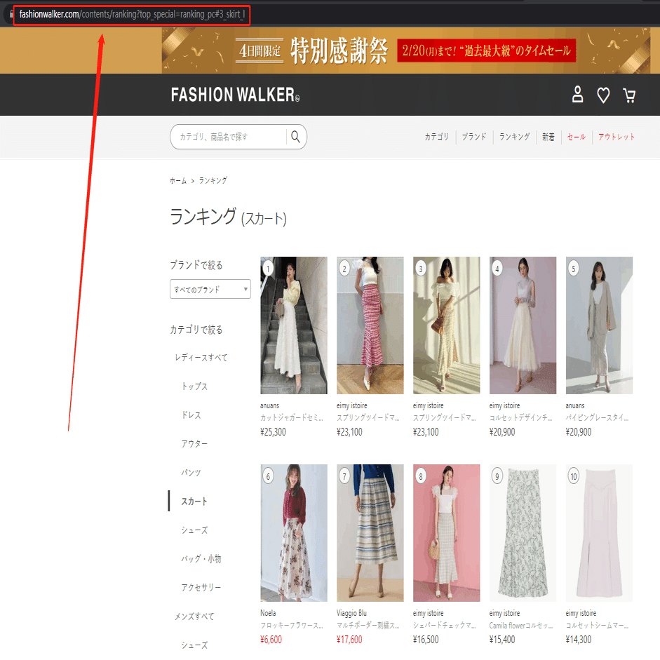 今回はスカートの売り切れランニング一覧ページを例として、スクレイピング方法を紹介します。まず、URLをコピーしてください。
