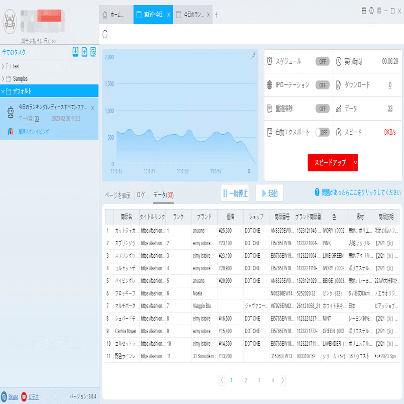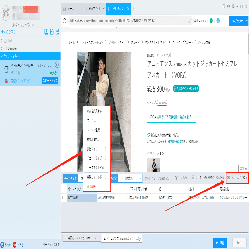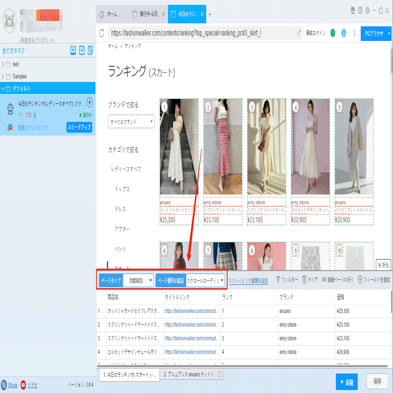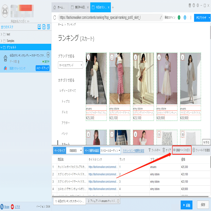 色、素材、価格、商品説明などの詳細情報は詳細ページに付いていますから、ソフトウェアの「詳細ページに行く」機能を利用して、データを抽出します。
