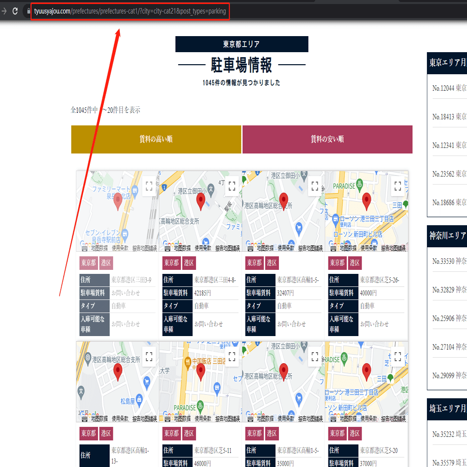 今回は東京都の駐車場一覧ページを例として、スクレイピング方法を紹介します。まず、URLをコピーしてください。
