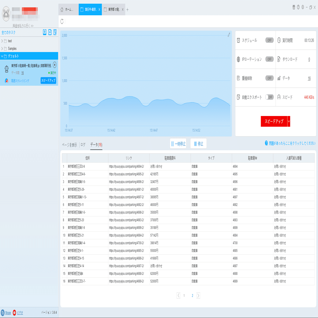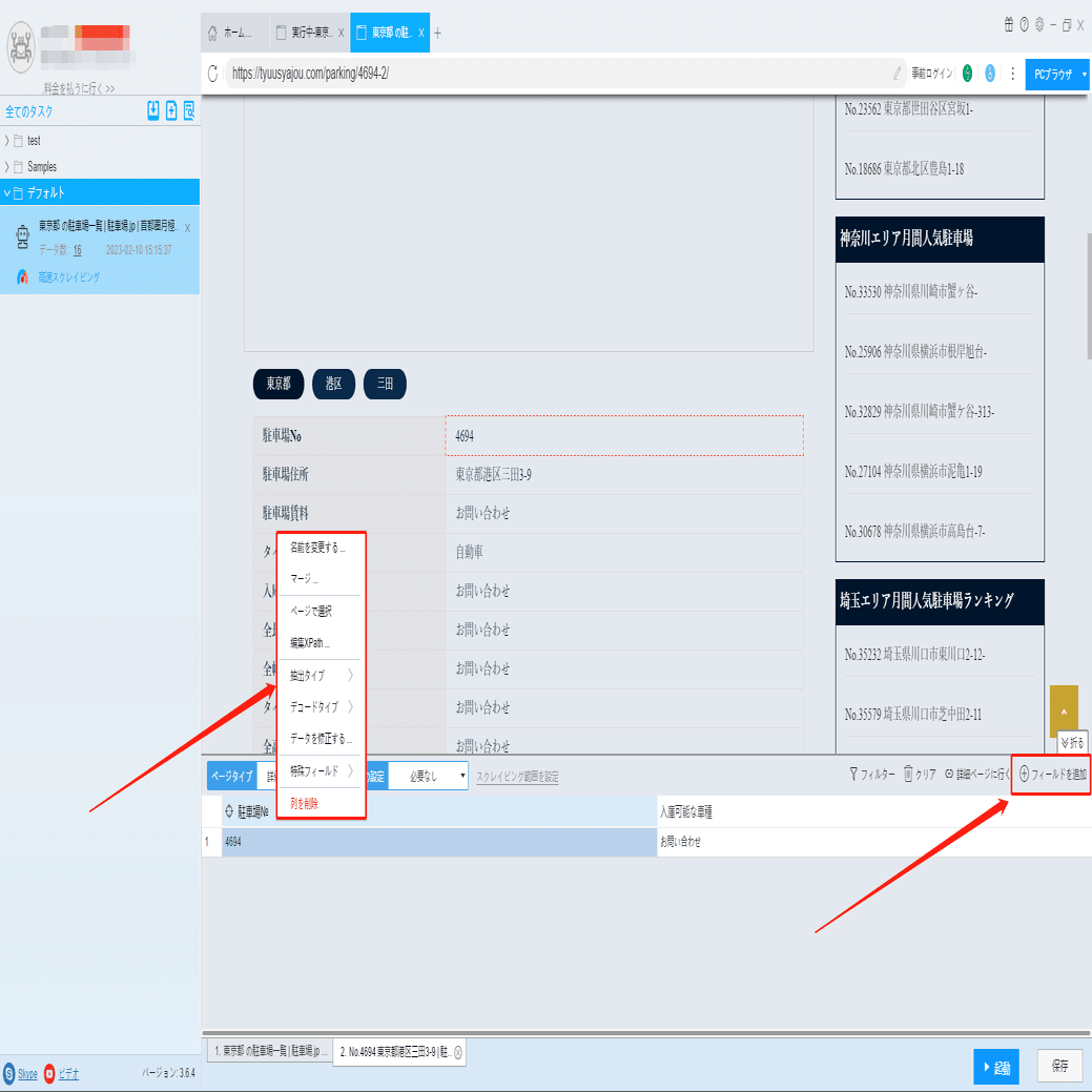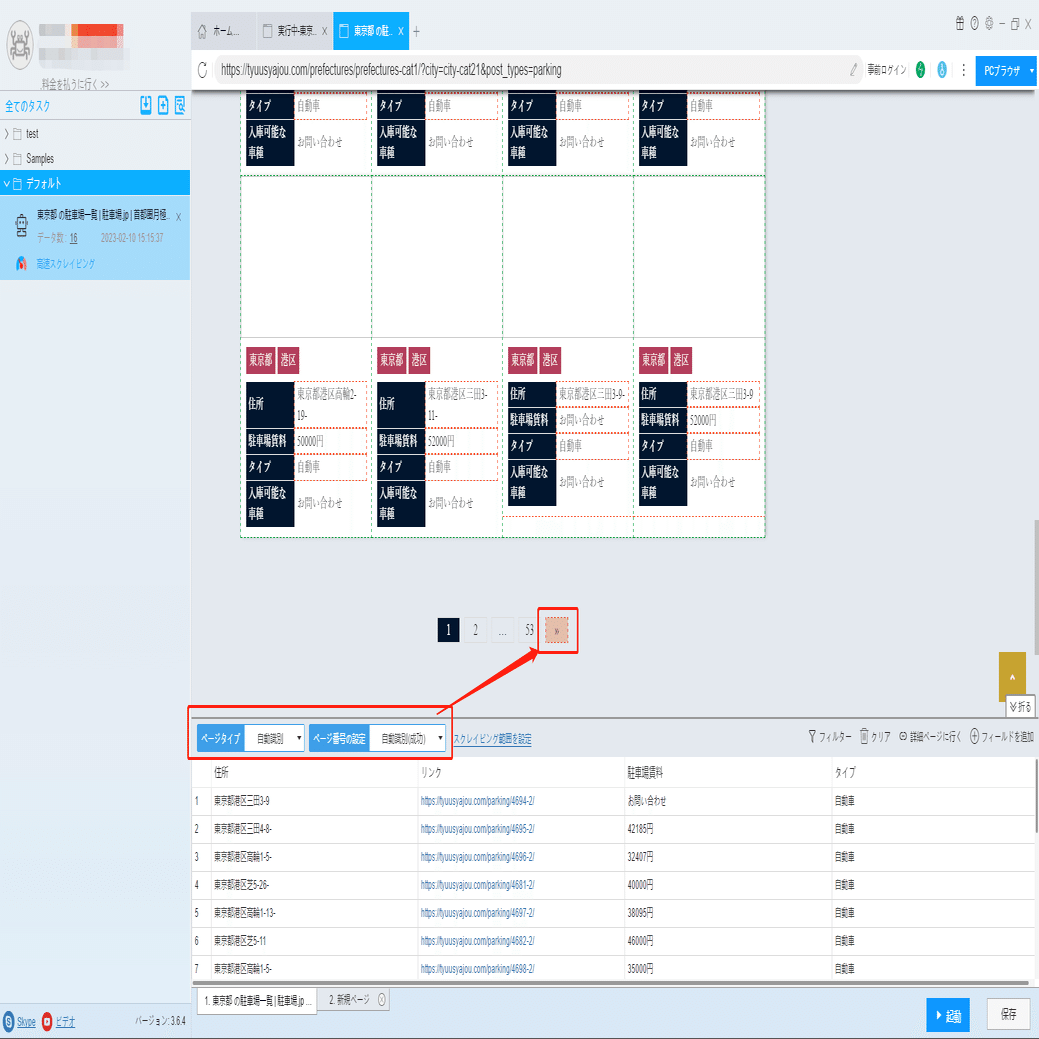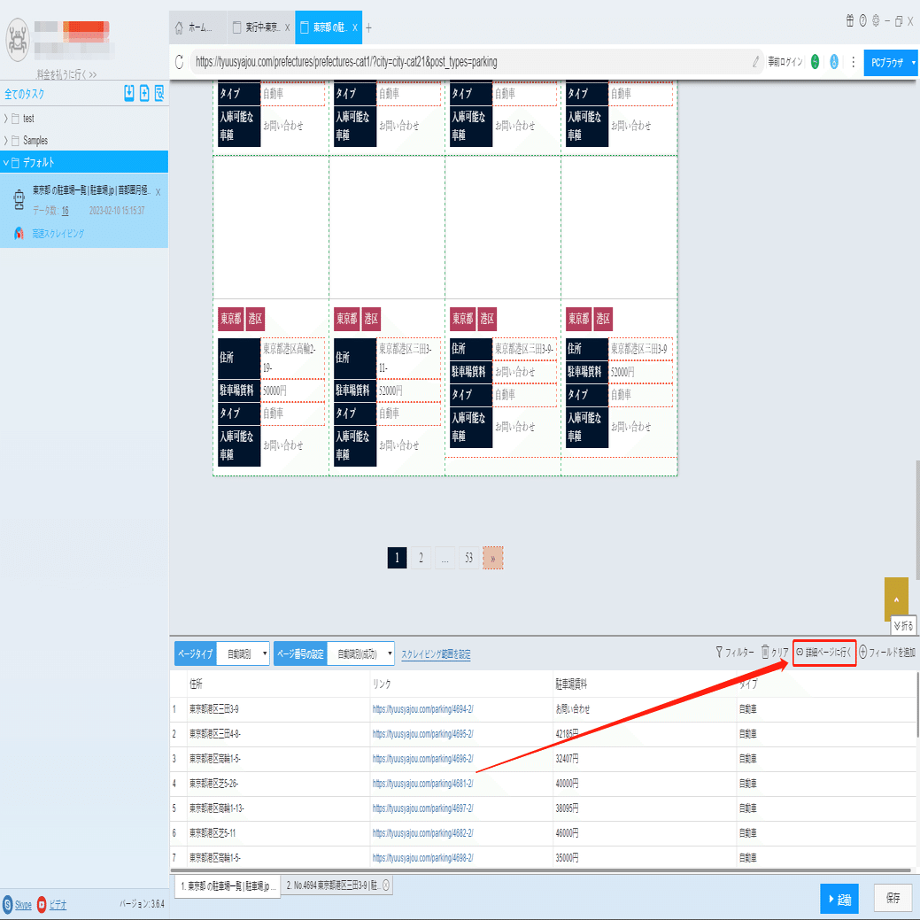 住所、駐車場№、入庫可能車種などの詳細情報は詳細ページに付いていますから、ソフトウェアの「詳細ページに行く」機能を利用して、データを抽出します。