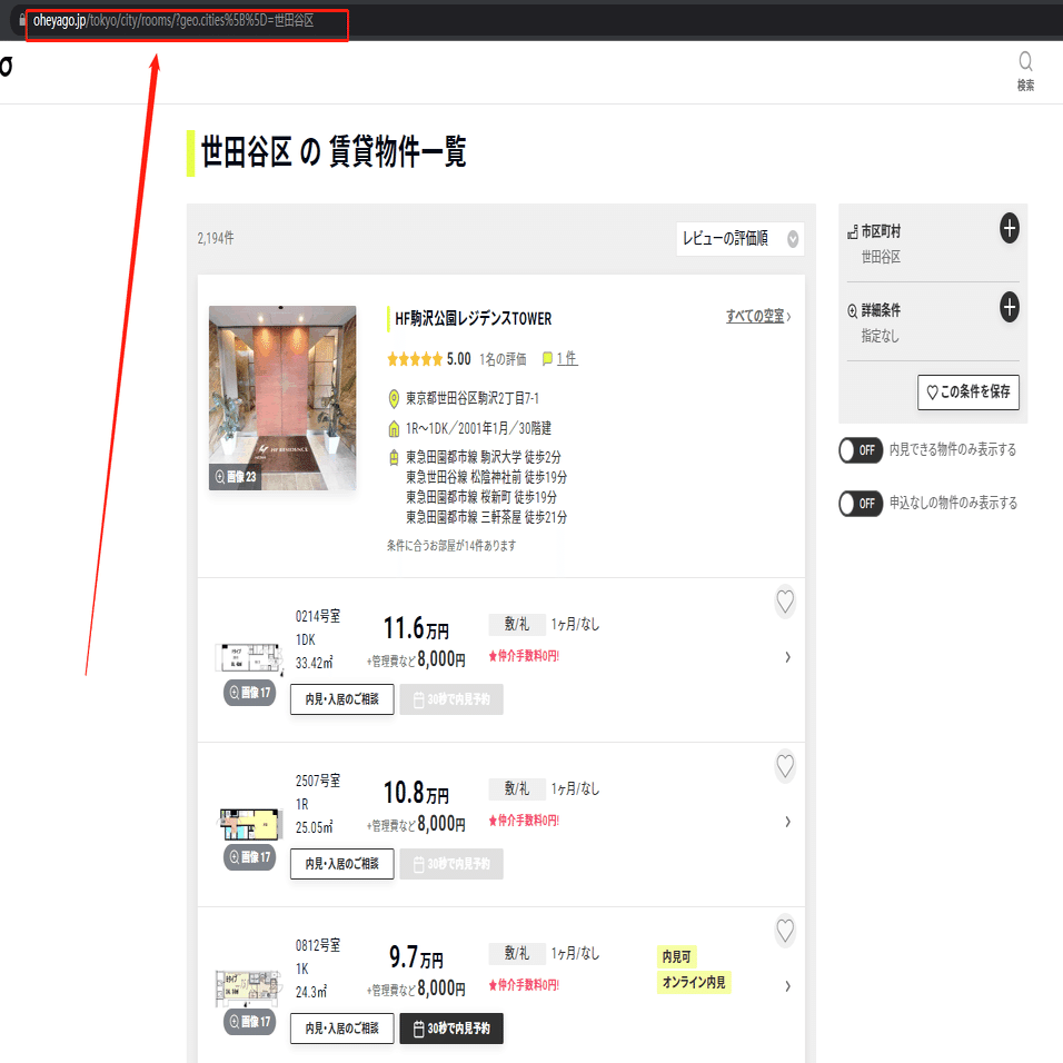 今回は世田谷区の賃貸物件一覧ページを例として、スクレイピング方法を紹介します。まず、URLをコピーしてください。