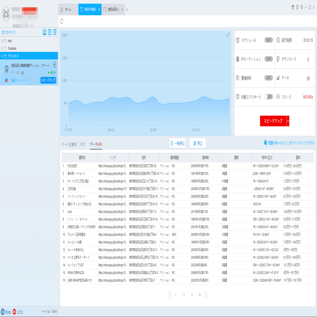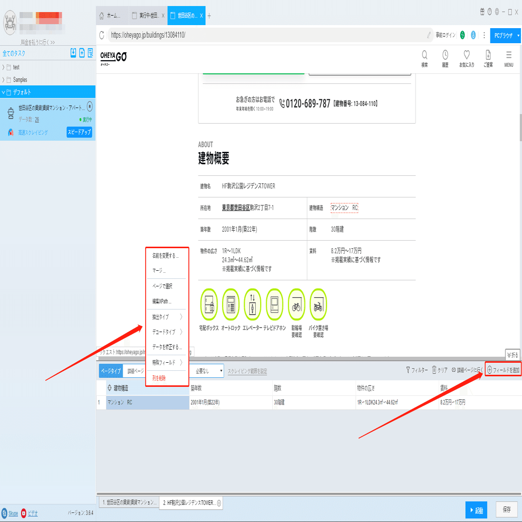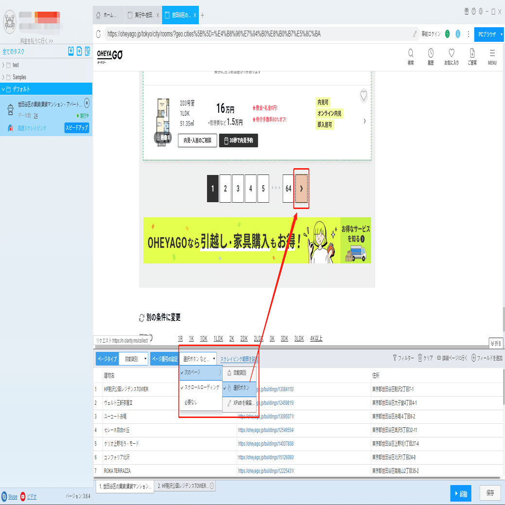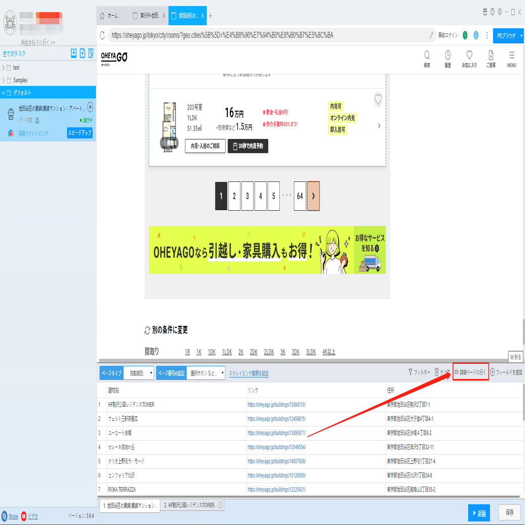築年数、階数、物件の広さ、賃料などの詳細情報は詳細ページに付いていますから、ソフトウェアの「詳細ページに行く」機能を利用して、データを抽出します。