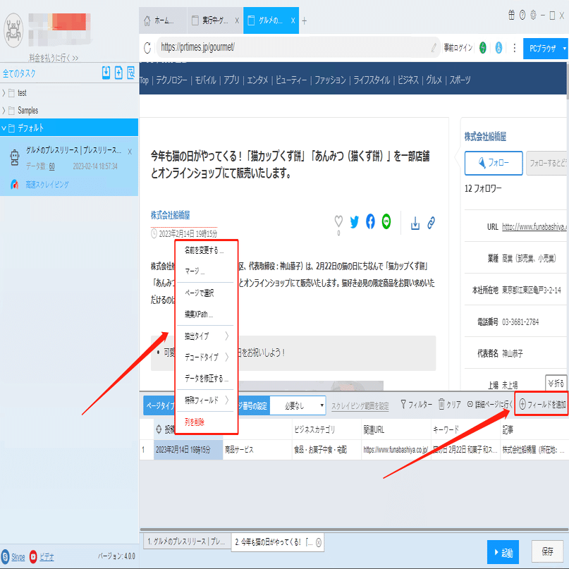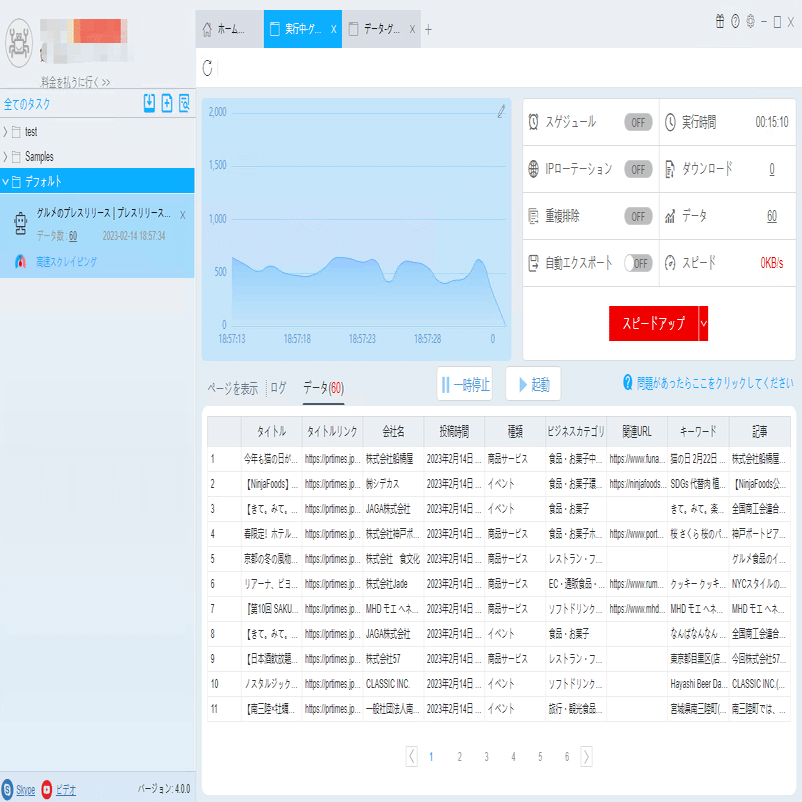 キーワード、ビジネスカテゴリ、記事などの詳細情報は詳細ページに付いていますから、ソフトウェアの「詳細ページに行く」機能を利用して、データを抽出します。