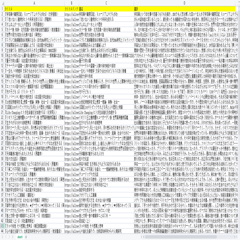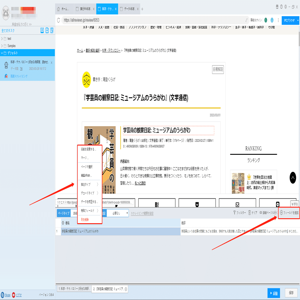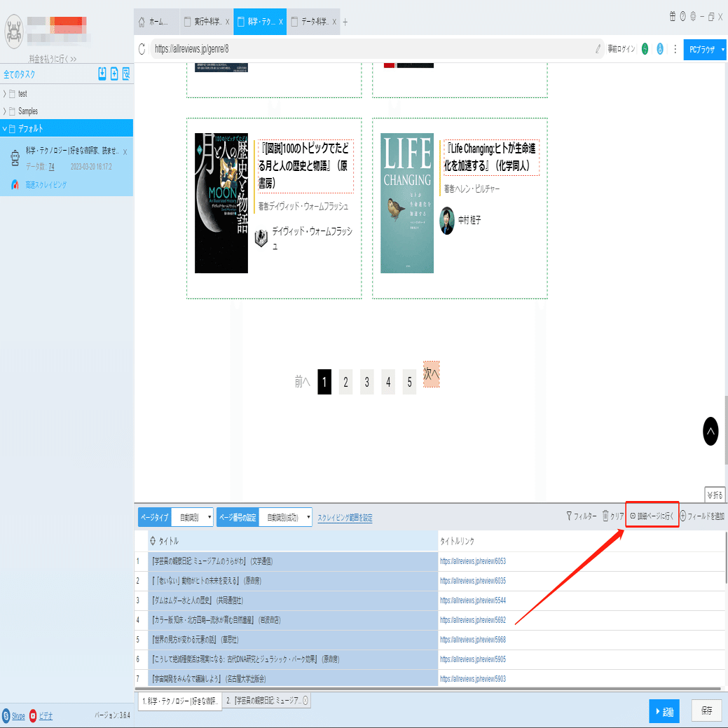 書評、評者などの詳細情報は詳細ページに付いていますから、ソフトウェアの「詳細ページに行く」機能を利用して、データを抽出します。