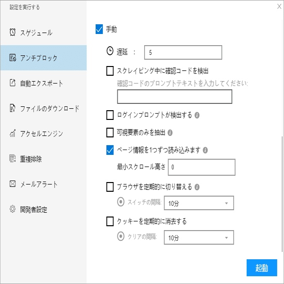 必要に応じて、スケジュール、アンチブロック、自動エクスポート、写真のダウンロード、スピードブーストを設定できます。サーバーに負荷しないように、遅延時間を設定してください。5秒以上を推薦します。スクレイピングタスクを配置する方法については、下記のチュートリアルをご参照ください。