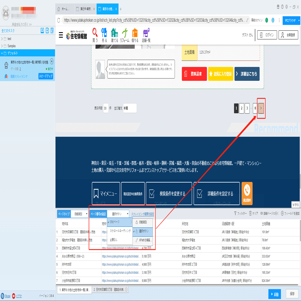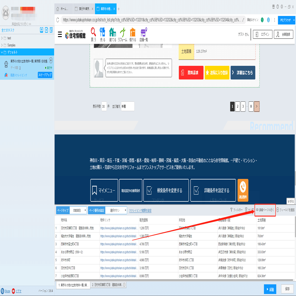 坪単価、私道面積、物件管理番号などの詳細情報は詳細ページに付いていますから、ソフトウェアの「詳細ページに行く」機能を利用して、データを抽出します。