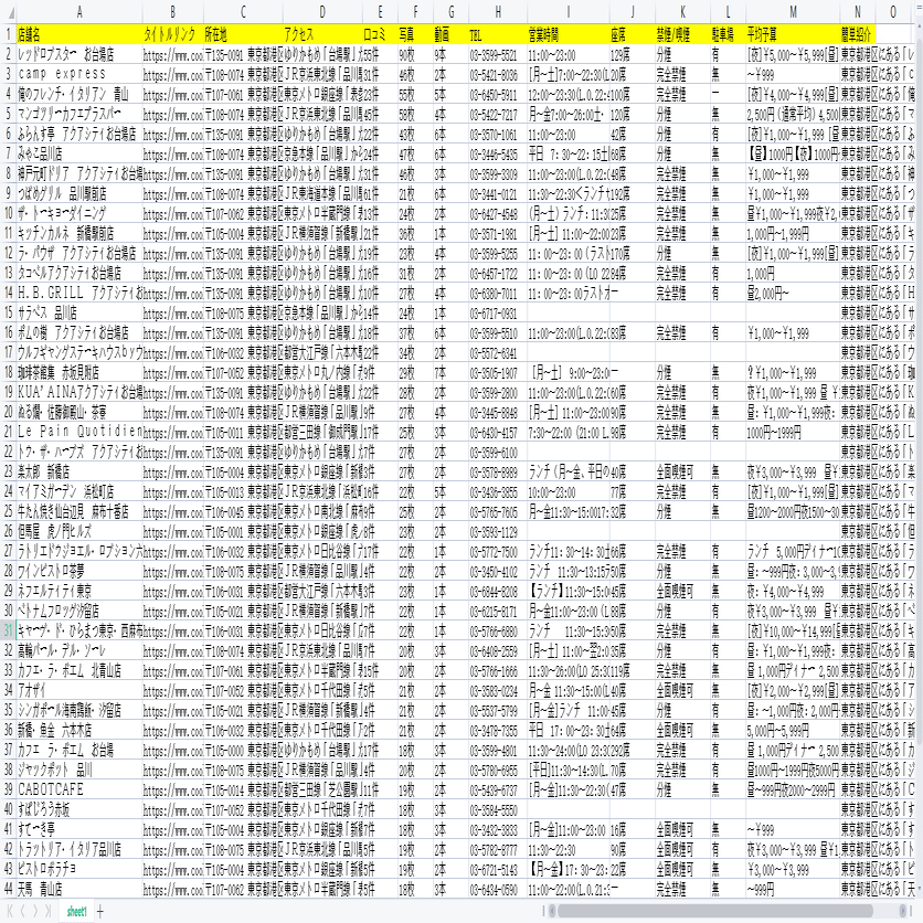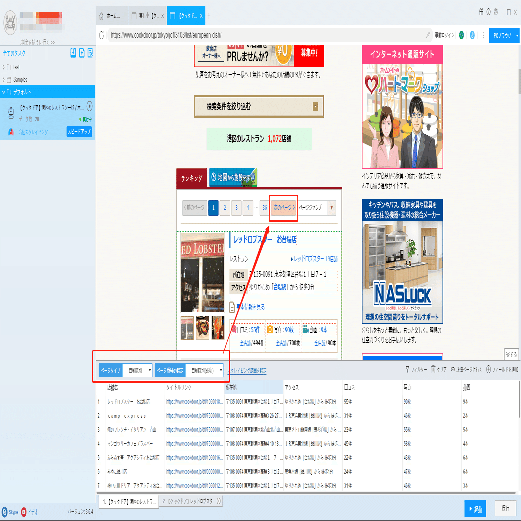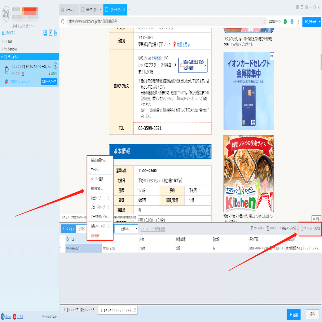 TEL、座席、駐車場などの詳細情報は詳細ページに付いていますから、ソフトウェアの「詳細ページに行く」機能を利用して、データを抽出します。
