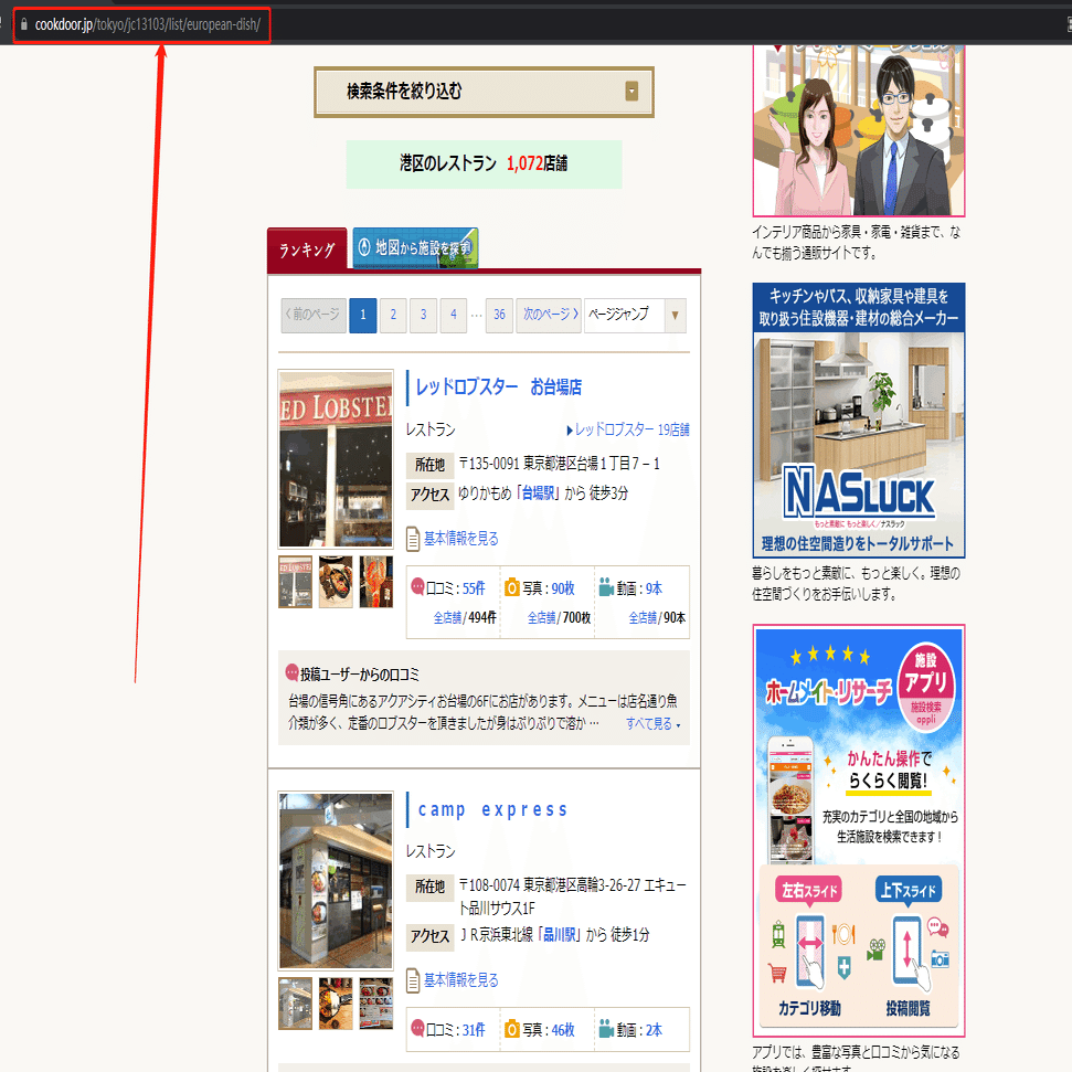 今回は港区のレストラン一覧ページを例として、スクレイピング方法を紹介します。まず、URLをコピーしてください。