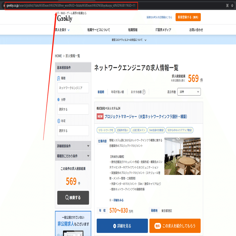 今回はネットワークエンジニアの求人情報一覧ページを例として、スクレイピング方法を紹介します。まず、URLをコピーしてください。