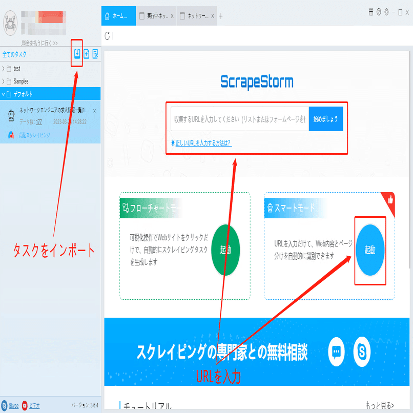 ScrapeStormのホムページ画面にスマートモードタスクを新規作成します。また、持っているタスクをインポートすることもできます。