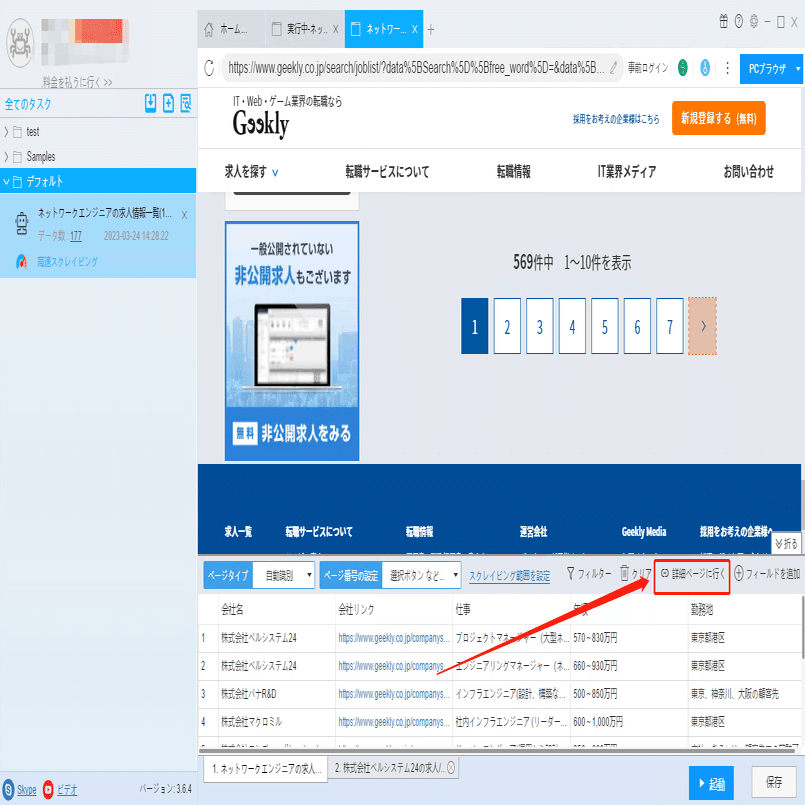 設立年月、売上高、資本金などの詳細情報は詳細ページに付いていますから、ソフトウェアの「詳細ページに行く」機能を利用して、データを抽出します。