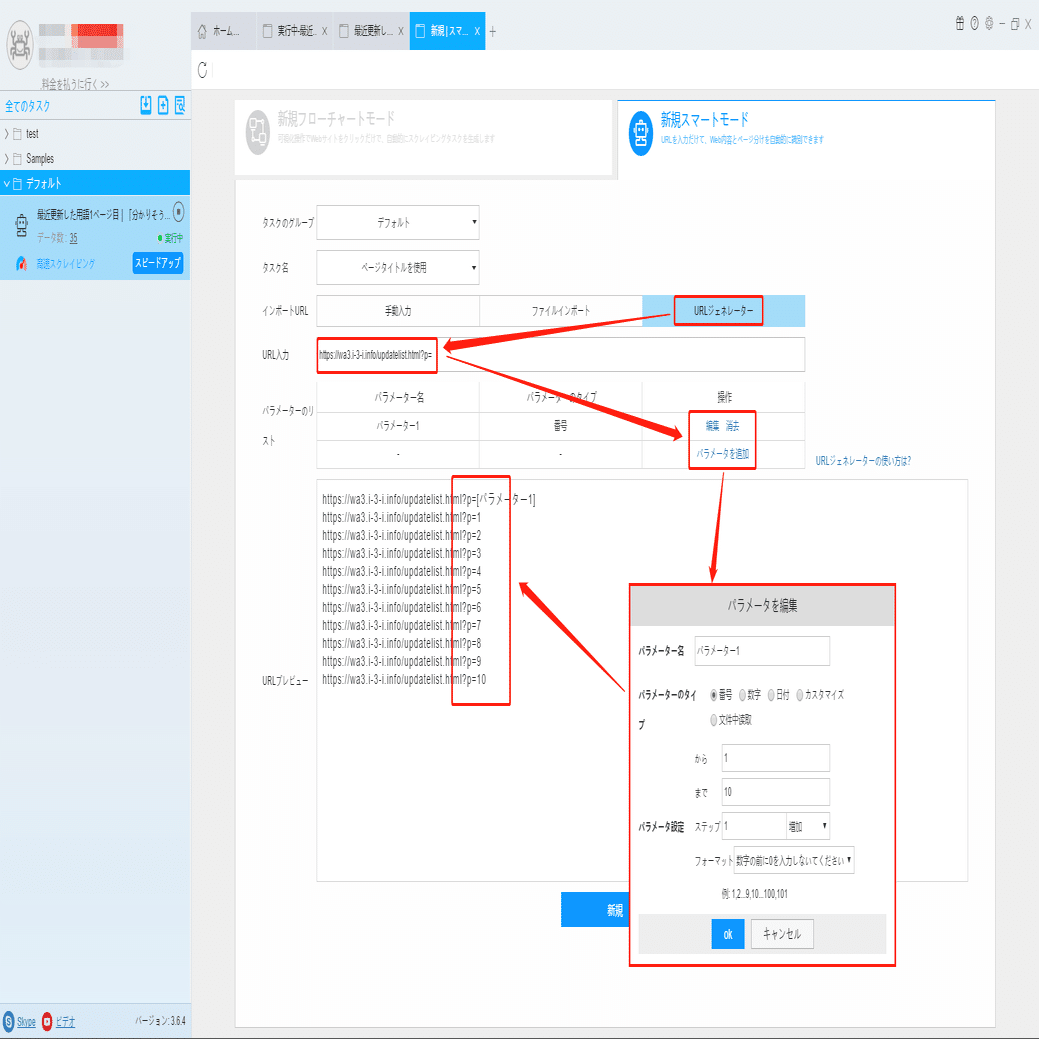 URLジェネレーターでURLを入力して、パラメーターを追加画面にページ数を入力します。今回は10までです。生成したURLはプレビュー画面でチェックしてください。
