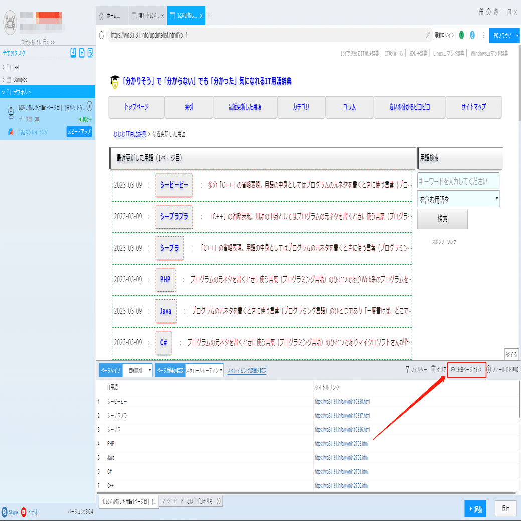 用語の解説は詳細ページに行くとスクレイピングできます。「詳細ページに行く」ボタンをクリックしてください。下記のチュートリアルをご参照ください。