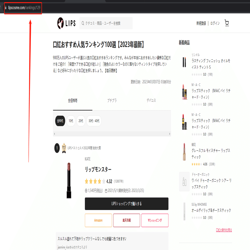 今回は口紅おすすめ人気ランキング100選【2023年最新】ページを例として、スクレイピング方法を紹介します。まず、URLをコピーしてください。