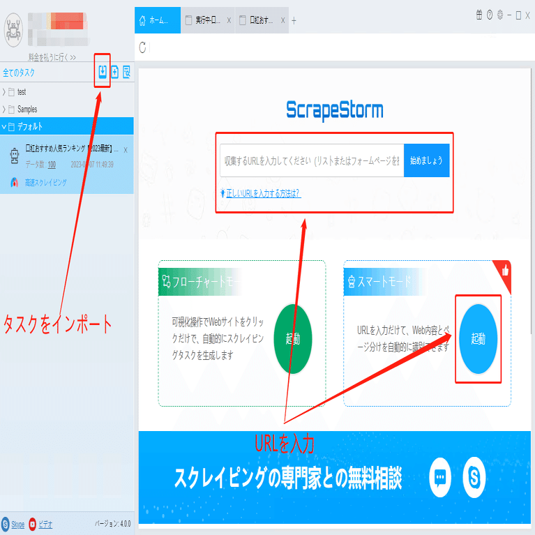 ScrapeStormのホムページ画面にスマートモードタスクを新規作成します。また、持っているタスクをインポートすることもできます。
