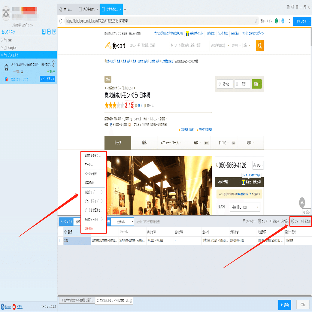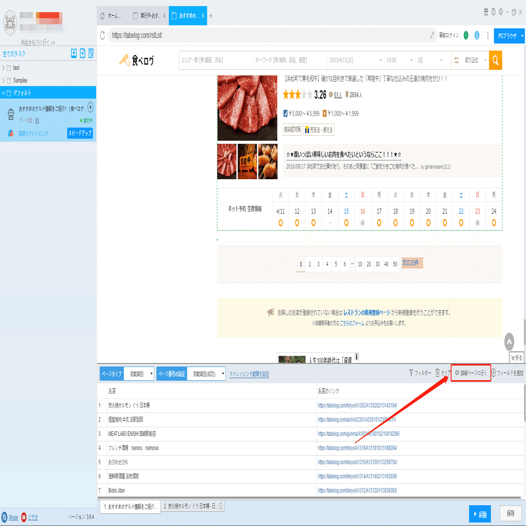 ジャンル、交通手段、営業時間などの詳細情報は詳細ページに付いていますから、ソフトウェアの「詳細ページに行く」機能を利用して、データを抽出します。