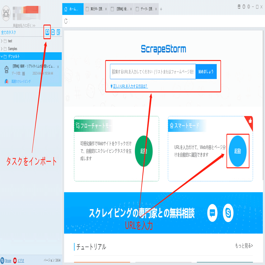 ScrapeStormのホムページ画面にスマートモードタスクを新規作成します。また、持っているタスクをインポートすることもできます。