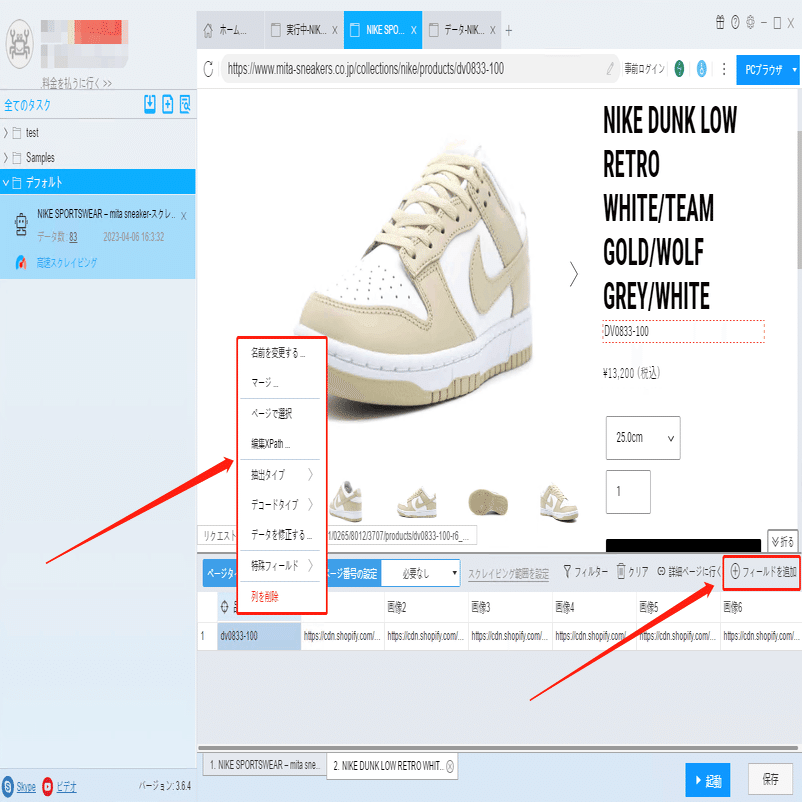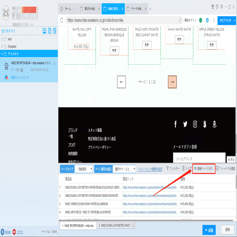 品番、画像などの詳細情報は詳細ページに付いていますから、ソフトウェアの「詳細ページに行く」機能を利用して、データを抽出します。
