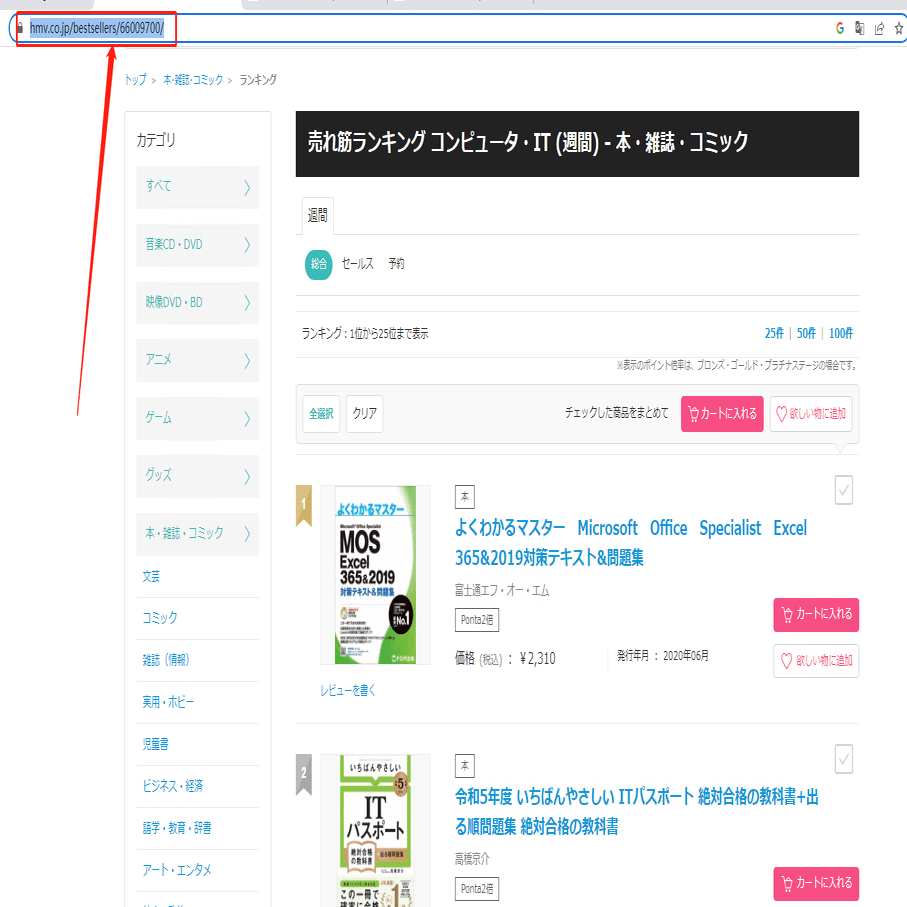 今回は”売れ筋ランキング コンピュータ・IT (週間) - 本・雑誌・コミック”ページを例として、スクレイピング方法を紹介します。まず、URLをコピーしてください。