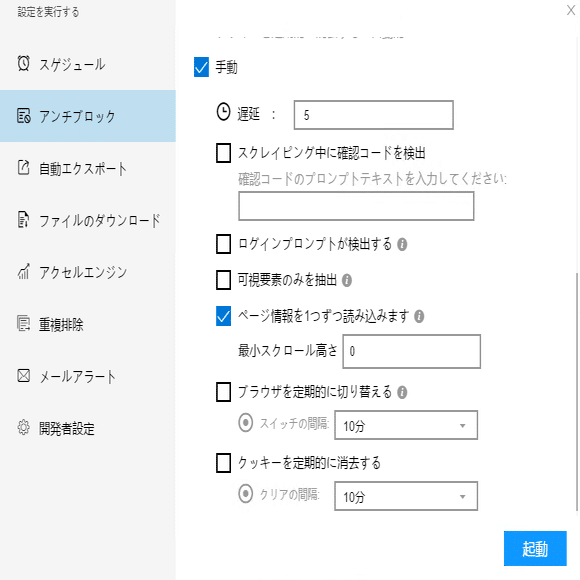 必要に応じて、スケジュール、アンチブロック、自動エクスポート、写真のダウンロード、スピードブーストを設定できます。サーバーに負荷しないように、遅延時間を設定してください。5秒以上を推薦します。スクレイピングタスクを配置する方法については、下記のチュートリアルをご参照ください。