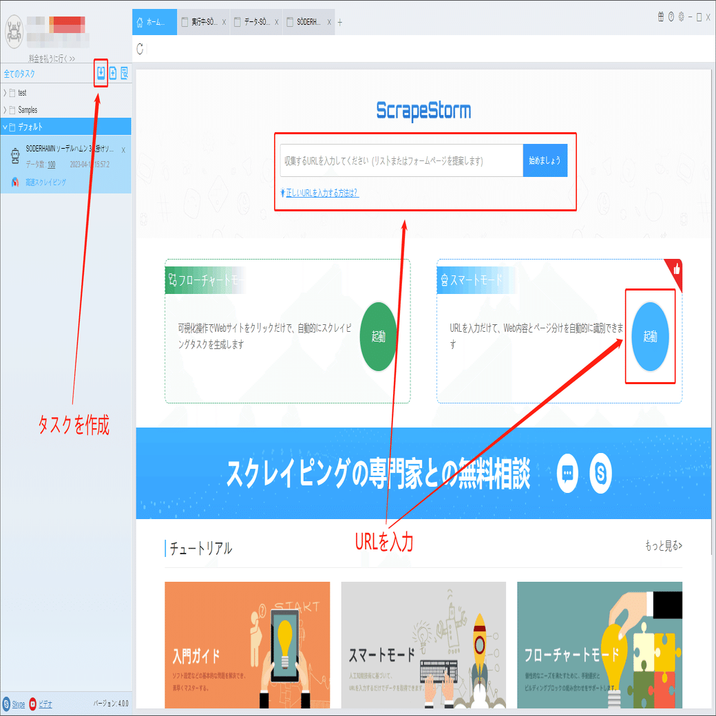 ScrapeStormのホムページ画面にスマートモードタスクを新規作成します。また、持っているタスクをインポートすることもできます。