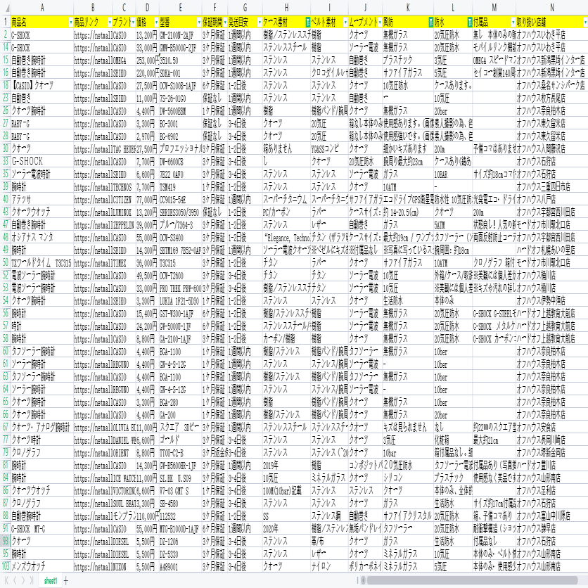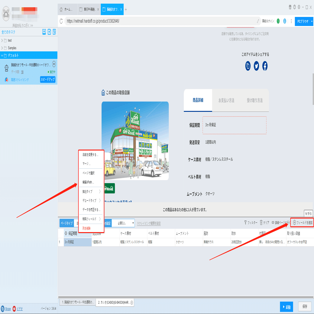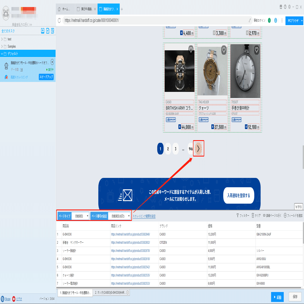 保証期間、防水、風防、素材などの詳細情報は詳細ページに付いていますから、ソフトウェアの「詳細ページに行く」機能を利用して、データを抽出します。