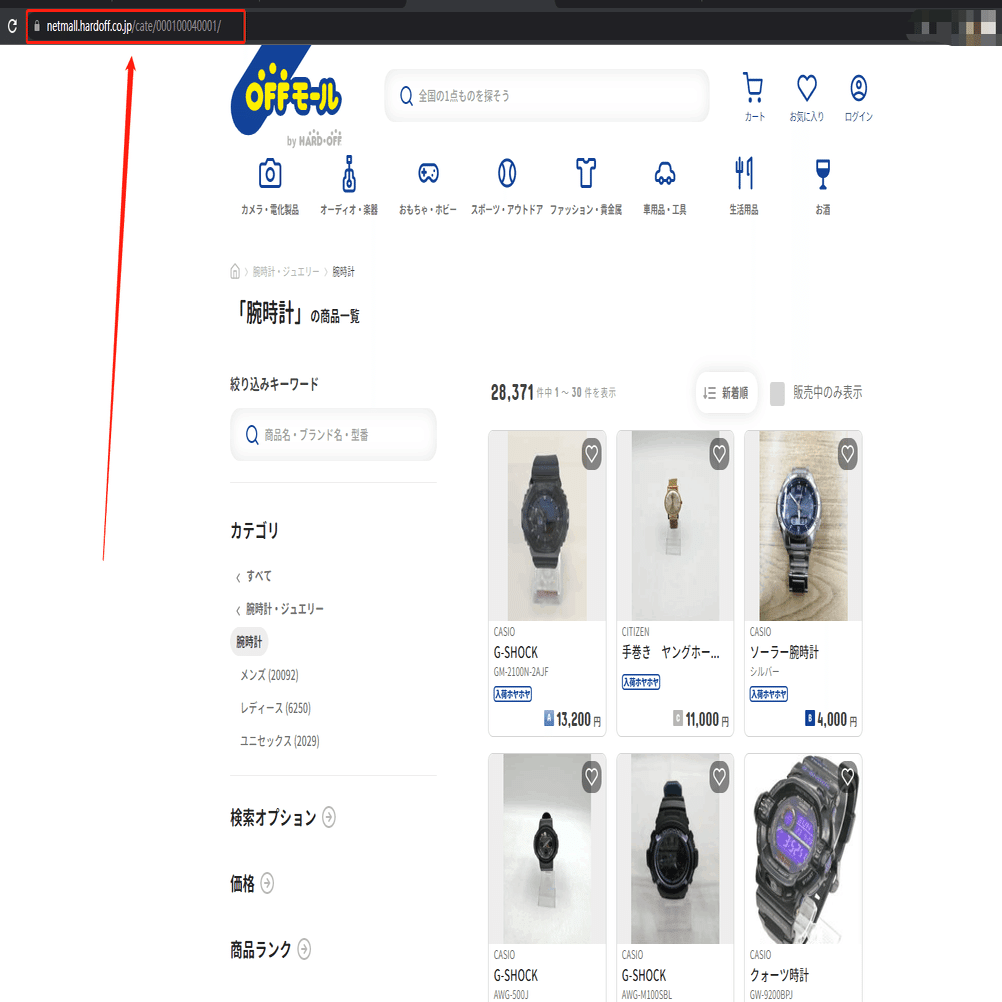 今回は腕時計の検索結果一覧ページを例として、スクレイピング方法を紹介します。まず、URLをコピーしてください。