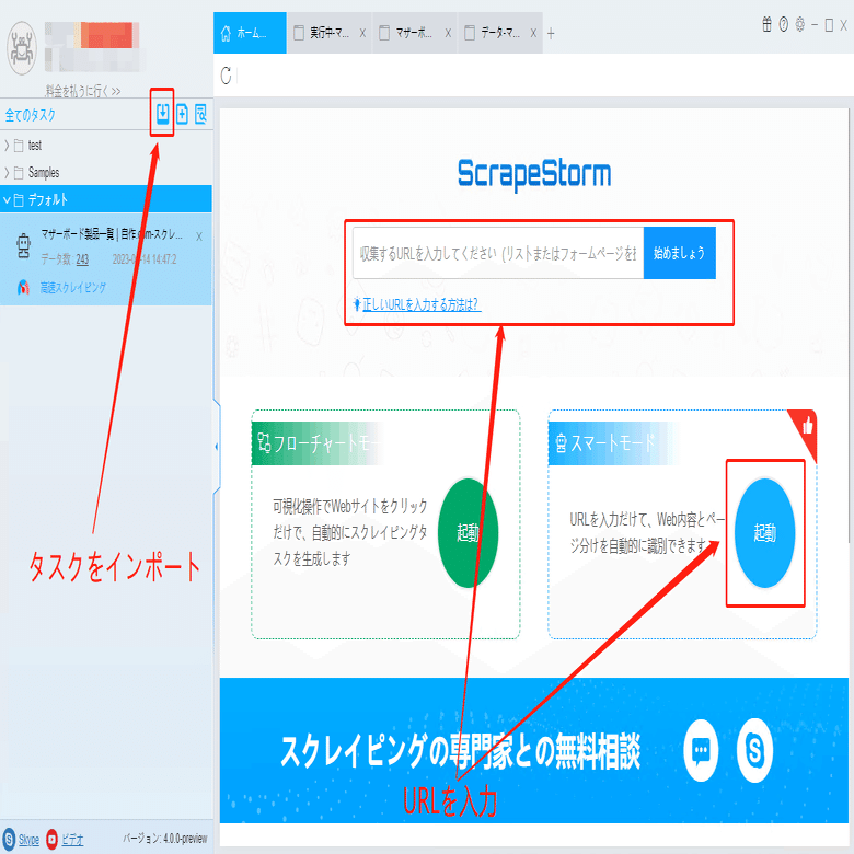 ScrapeStormのホムページ画面にスマートモードタスクを新規作成します。また、持っているタスクをインポートすることもできます。