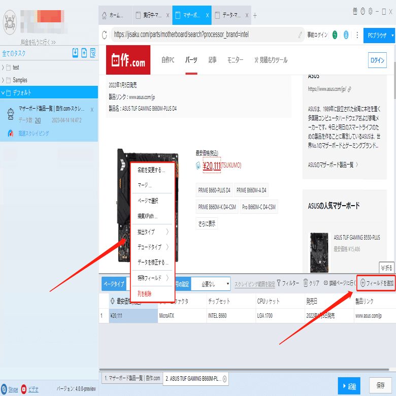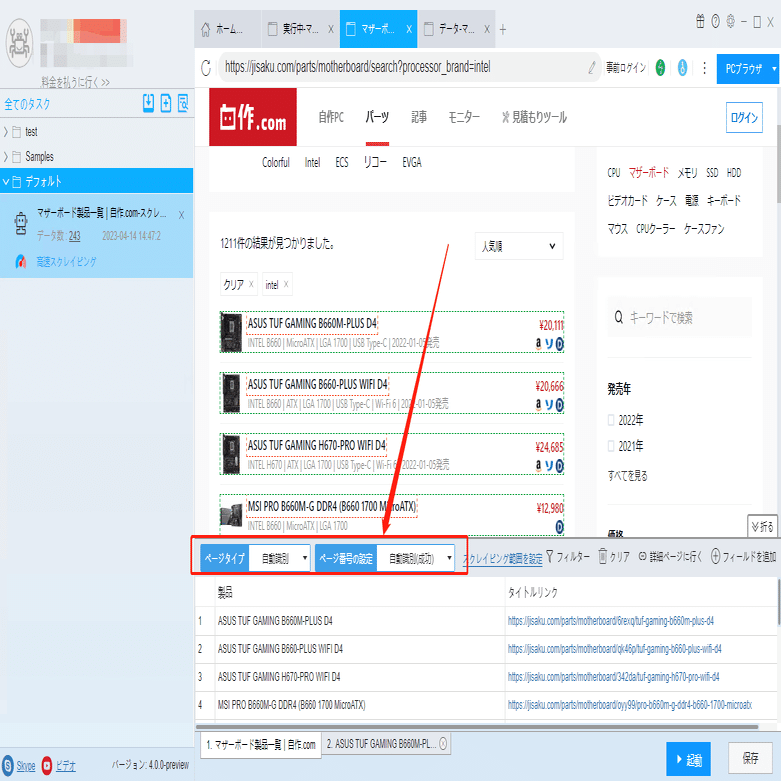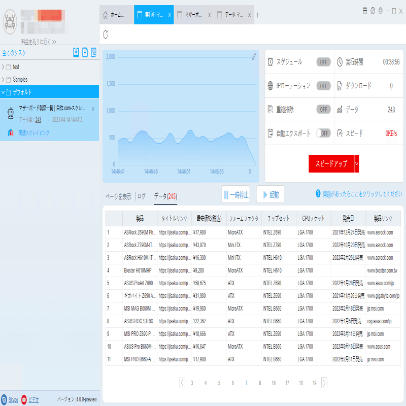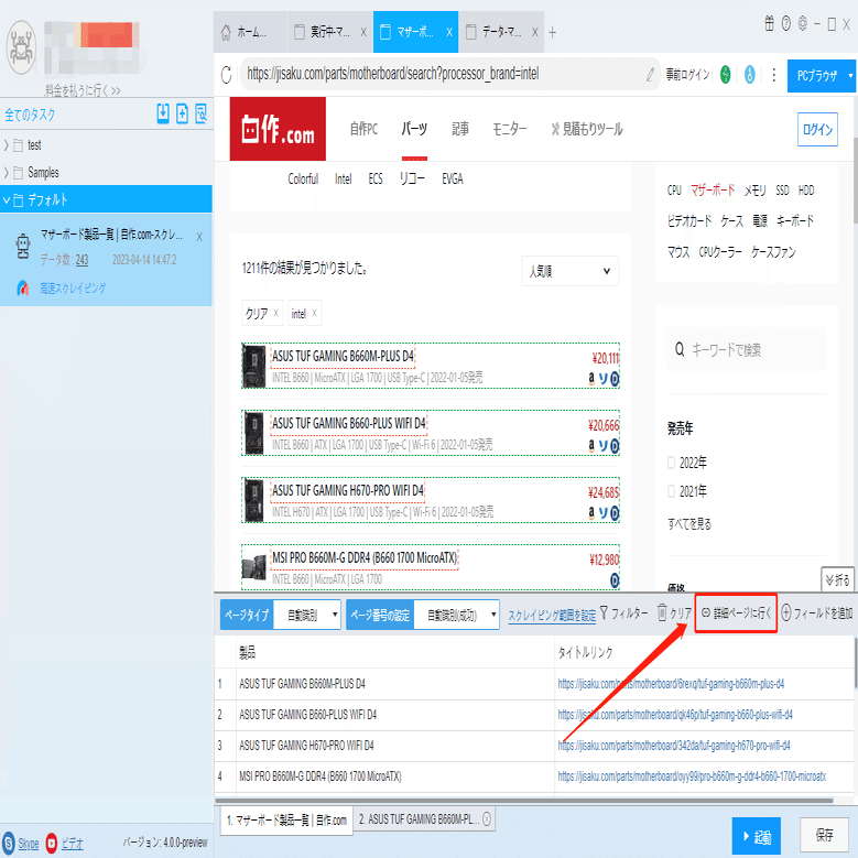 フォームファクタ、チップセット、CPUソケットなどの詳細情報は詳細ページに付いていますから、ソフトウェアの「詳細ページに行く」機能を利用して、データを抽出します。