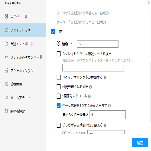必要に応じて、スケジュール、アンチブロック、自動エクスポート、写真のダウンロード、スピードブーストを設定できます。サーバーに負荷しないように、遅延時間を設定してください。5秒以上を推薦します。スクレイピングタスクを配置する方法については、下記のチュートリアルをご参照ください。