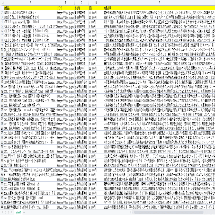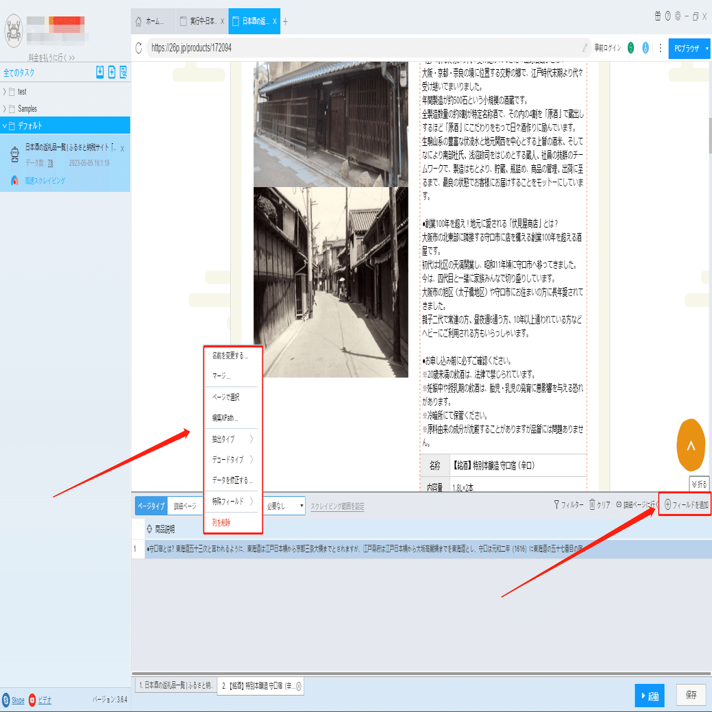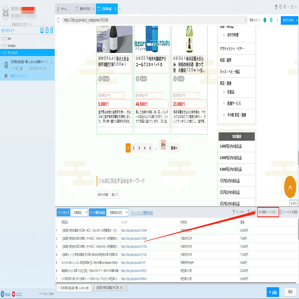 商品説明、原材料名、配送方法などの詳細情報は詳細ページに付いていますから、ソフトウェアの「詳細ページに行く」機能を利用して、データを抽出します。