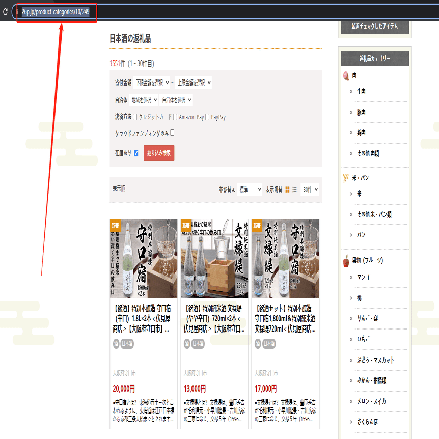 今回は日本酒の返礼品一覧ページを例として、スクレイピング方法を紹介します。まず、URLをコピーしてください。