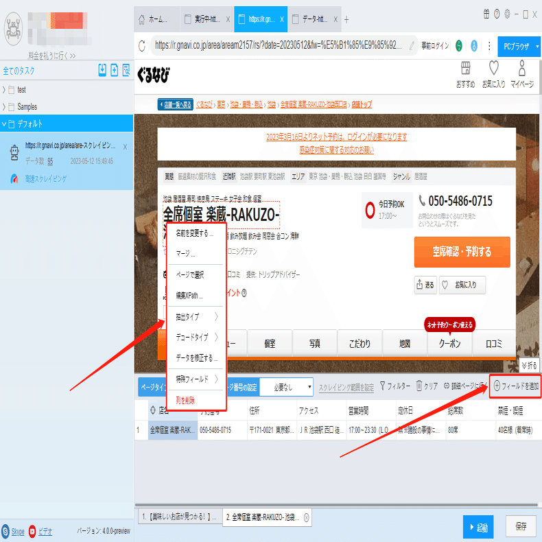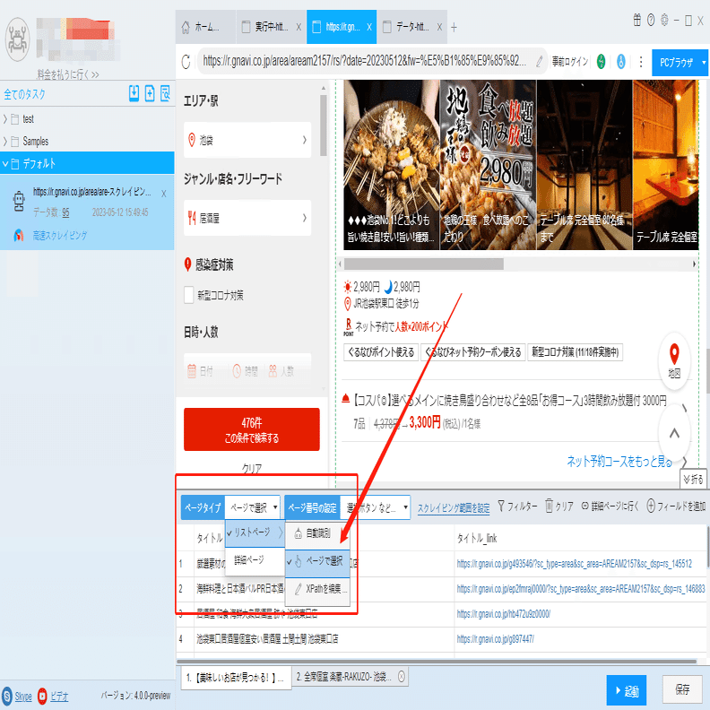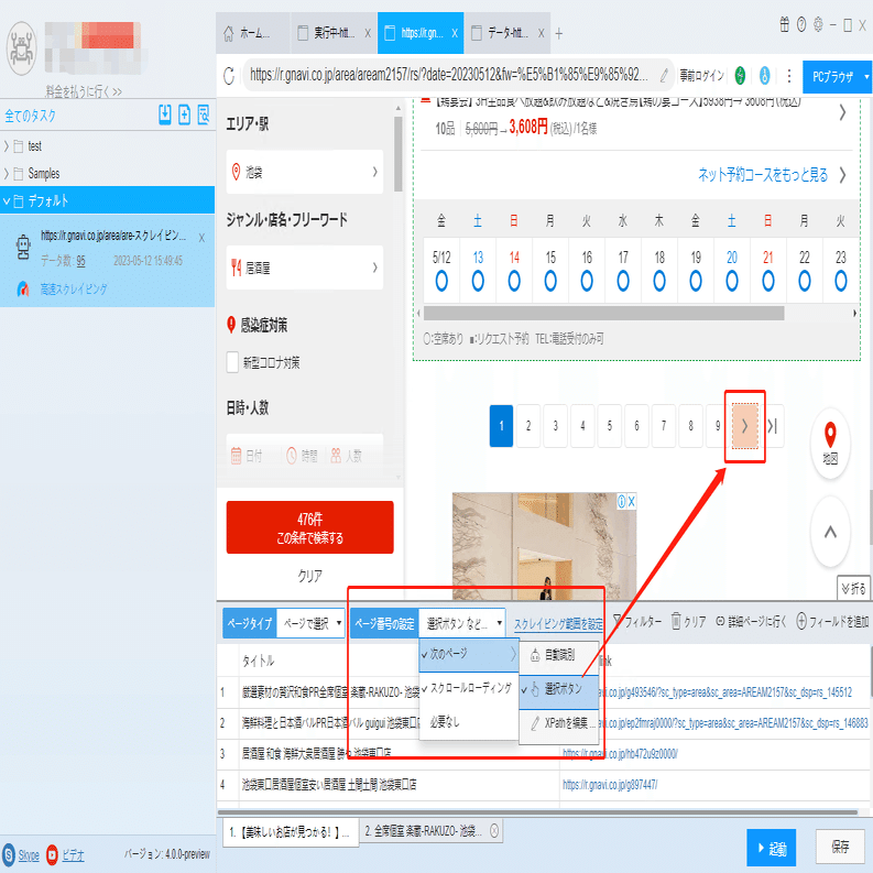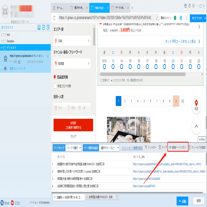 予約番号、住所、禁煙・喫煙などの詳細情報は詳細ページに付いていますから、ソフトウェアの「詳細ページに行く」機能を利用して、データを抽出します。