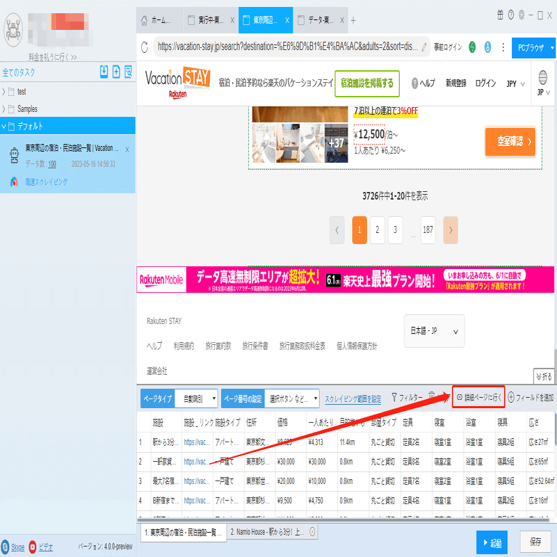 チェックイン/チェックアウト時間、対応言語などの詳細情報は詳細ページに付いていますから、ソフトウェアの「詳細ページに行く」機能を利用して、データを抽出します。