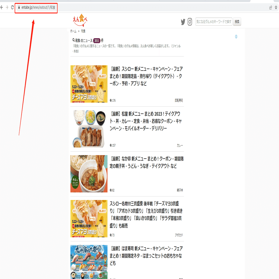 今回は「和食」のグルメに関するニュースの一覧ページを例として、スクレイピング方法を紹介します。まず、URLをコピーしてください。
