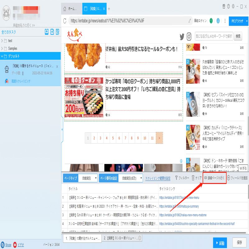 記事のジャンル、関連キーワードなどの詳細情報は詳細ページに付いていますから、ソフトウェアの「詳細ページに行く」機能を利用して、データを抽出します。