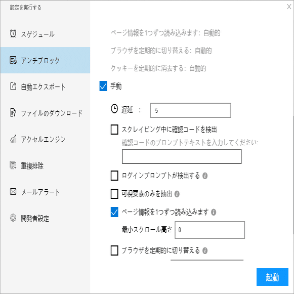 ソフトウェアは数多くの機能を提供します。必要に応じて、スケジュール、アンチブロック、自動エクスポート、画像のダウンロード、スピードブーストを設定できます。サーバーに負荷しないように、遅延時間を設定してください。5秒以上を推薦します。