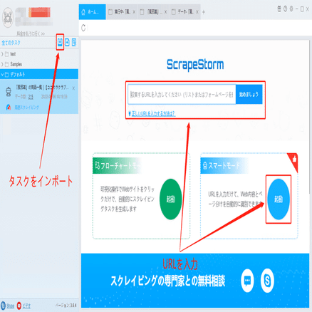 ScrapeStormのホムページ画面にスマートモードタスクを新規作成します。また、持っているタスクをインポートすることもできます。