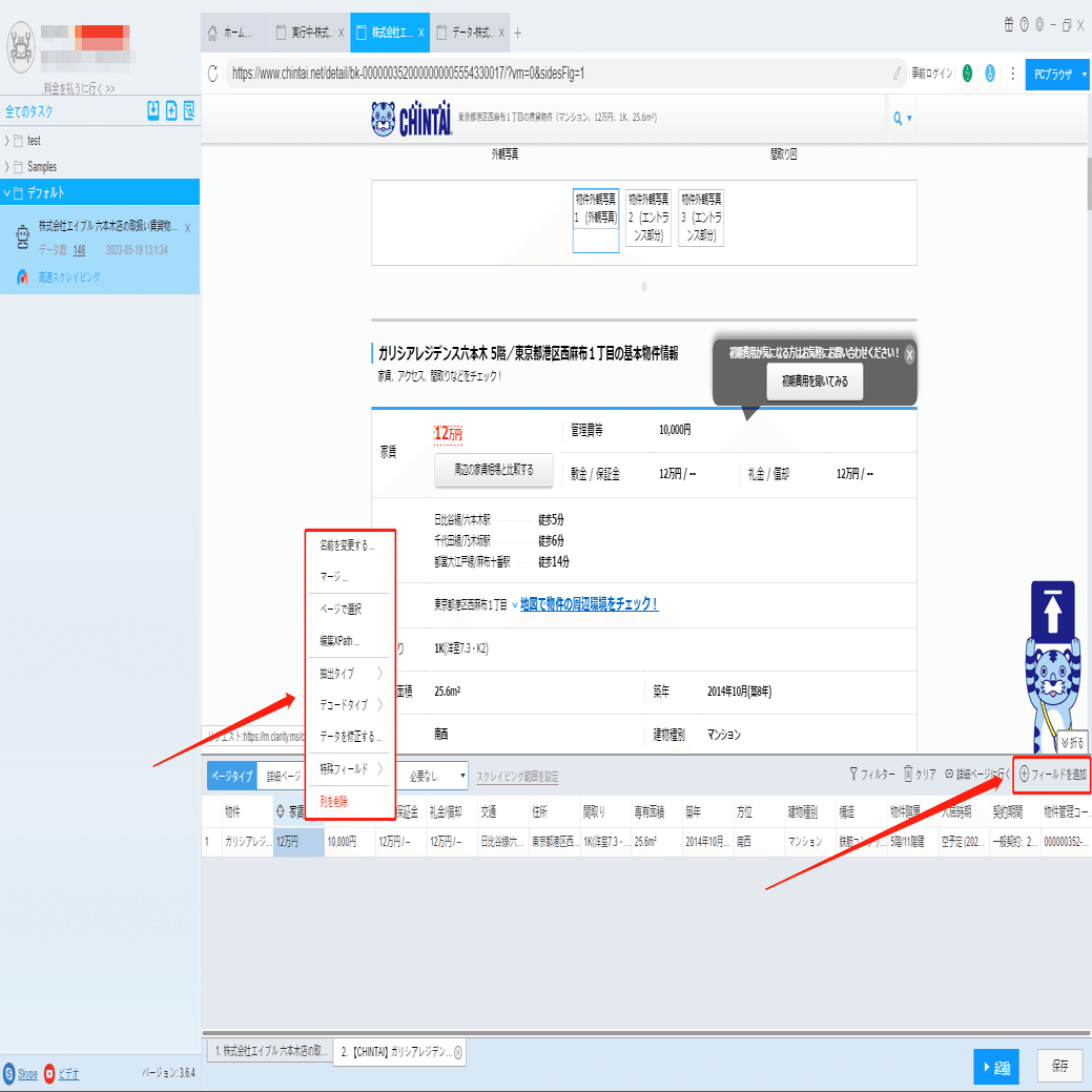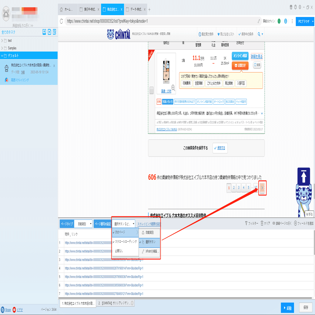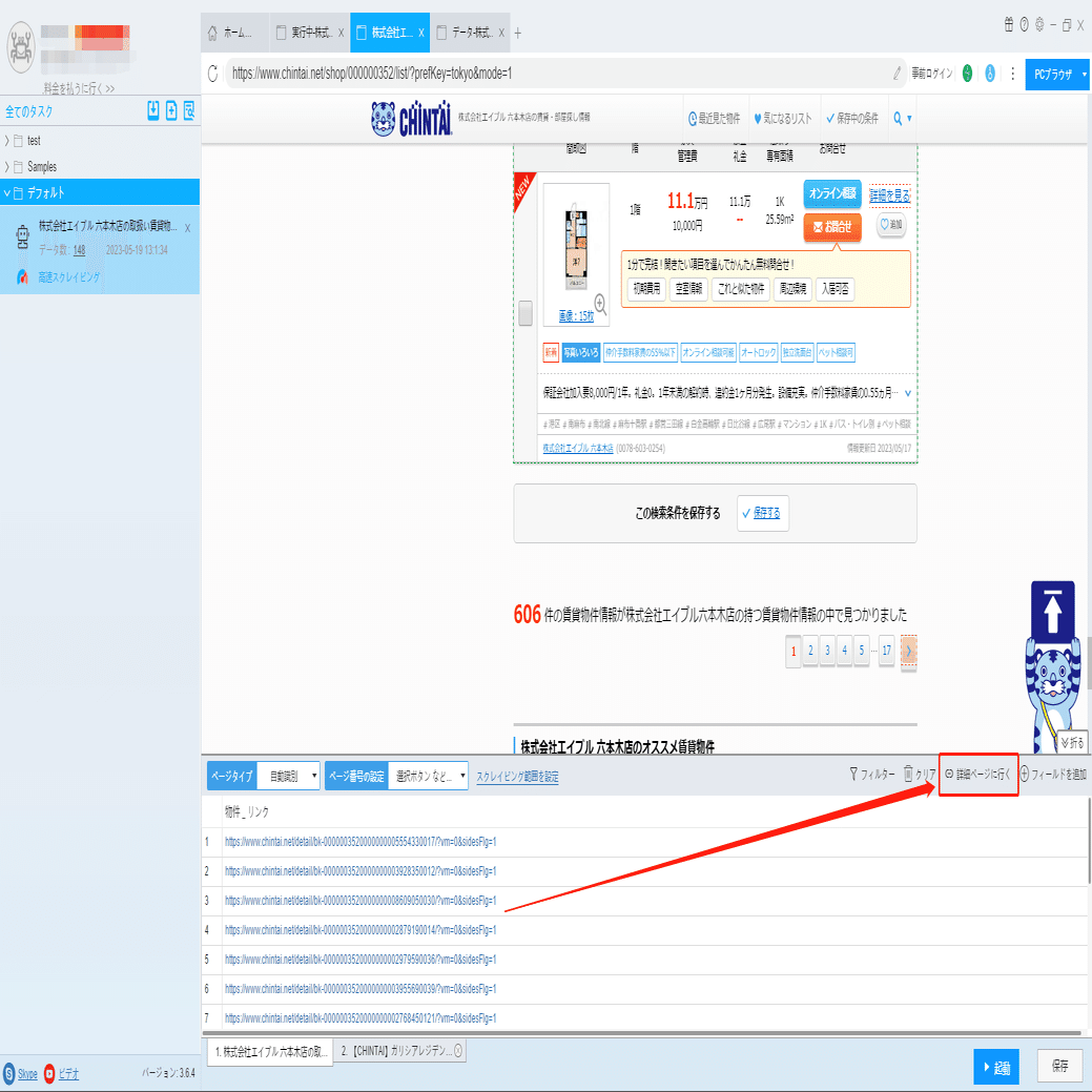 方位、専有面積、構造などの詳細情報は詳細ページに付いていますから、ソフトウェアの「詳細ページに行く」機能を利用して、データを抽出します。