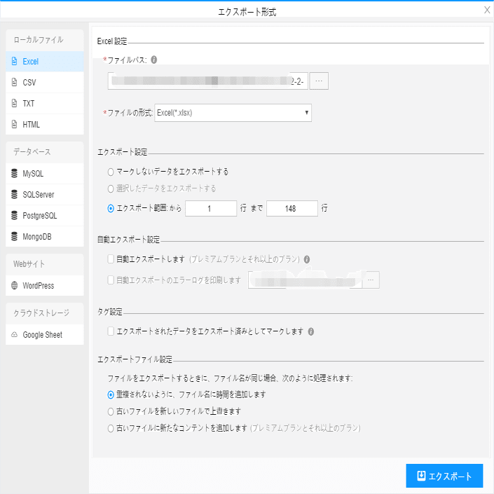 ScrapeStormは、Excel、csv、html、txt、データベース、ローカルなどさまざまなエクスポート方法を提供します。抽出結果のエクスポート方法の詳細には下記のチュートリアルをご参照ください。
