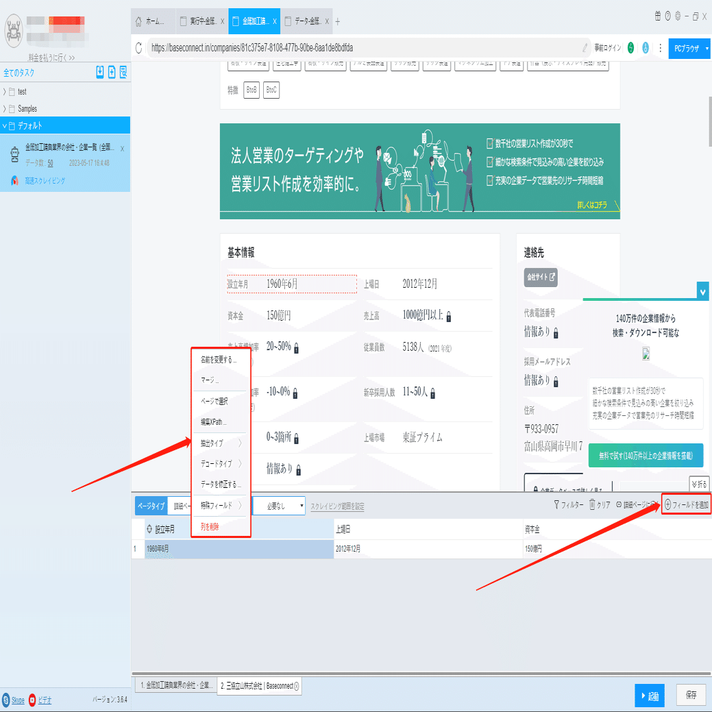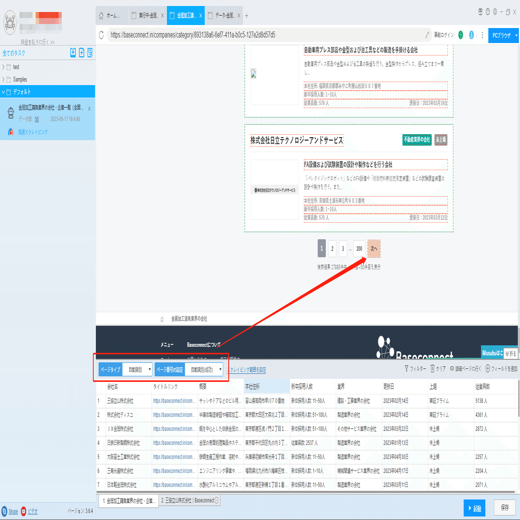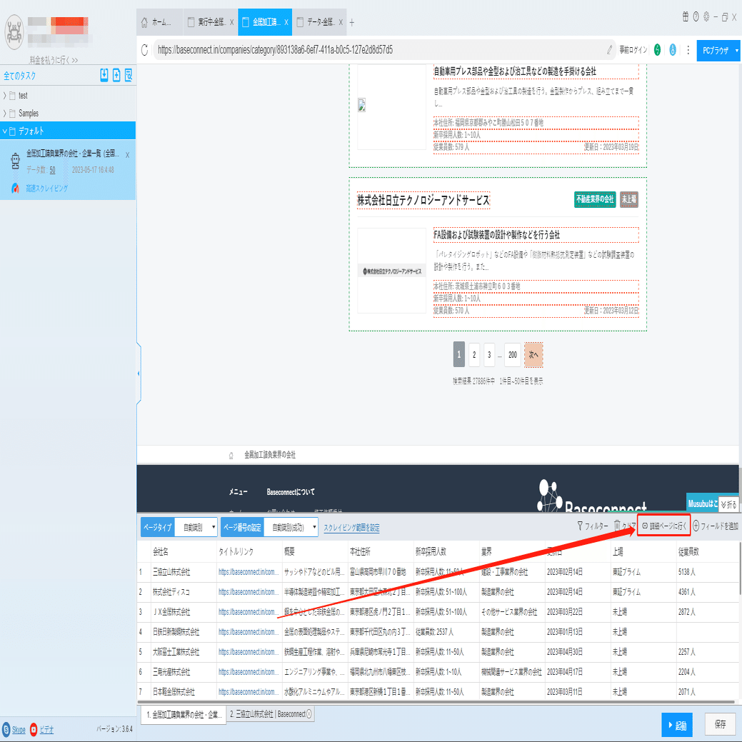 設立年月、売上高、資本金などの詳細情報は詳細ページに付いていますから、ソフトウェアの「詳細ページに行く」機能を利用して、データを抽出します。