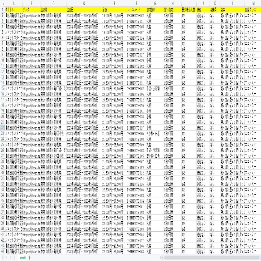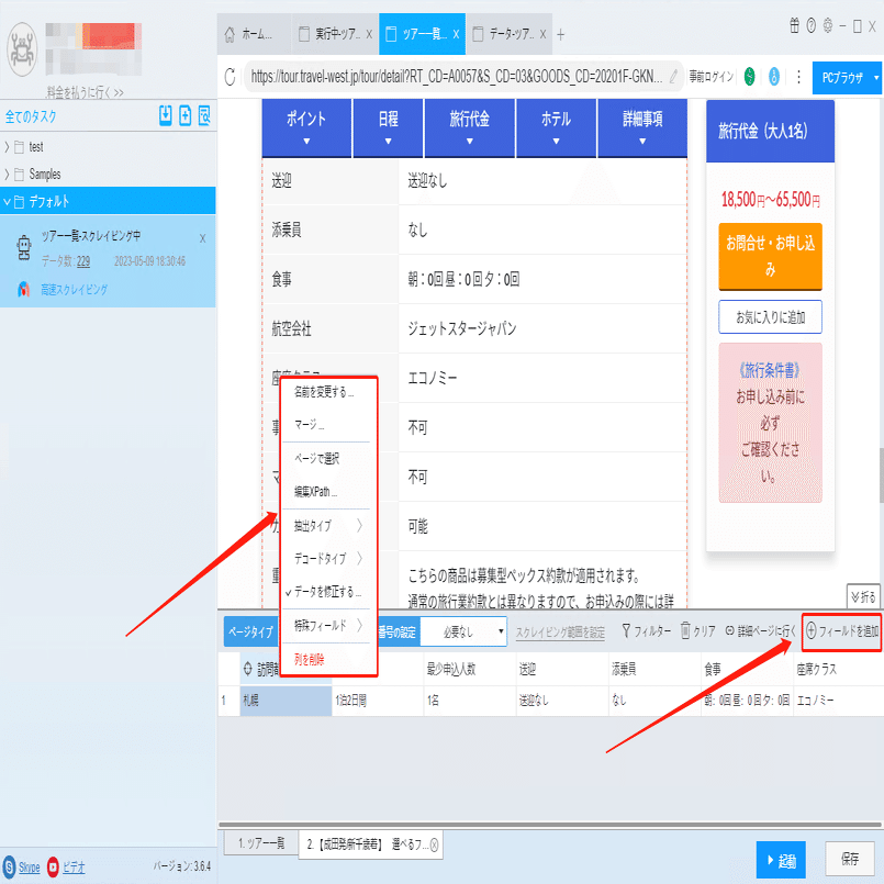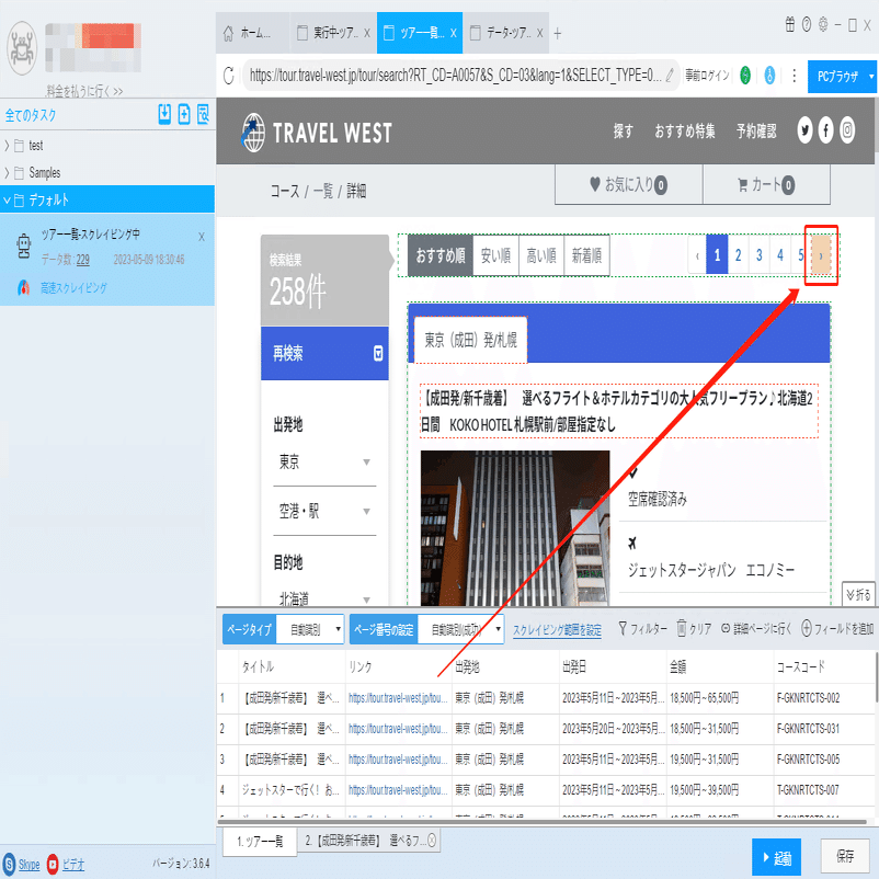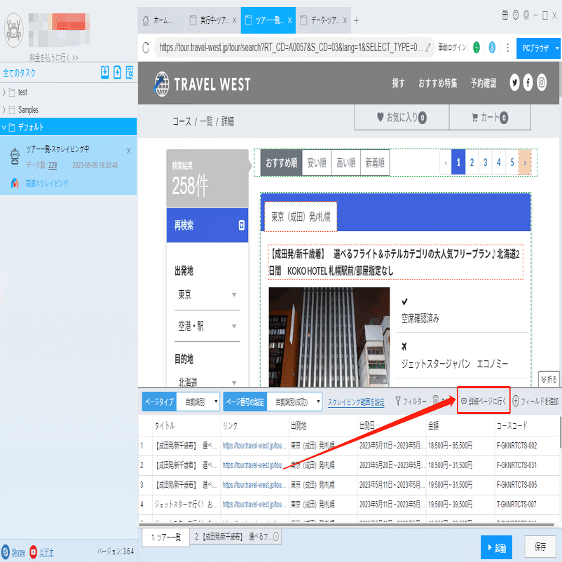 食事、添乗員、送迎などの詳細情報は詳細ページに付いていますから、ソフトウェアの「詳細ページに行く」機能を利用して、データを抽出します。