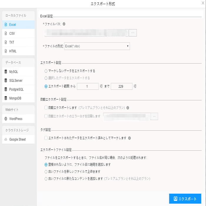 ScrapeStormは、Excel、csv、html、txt、データベース、ローカルなどさまざまなエクスポート方法を提供します。抽出結果のエクスポート方法の詳細には下記のチュートリアルをご参照ください。