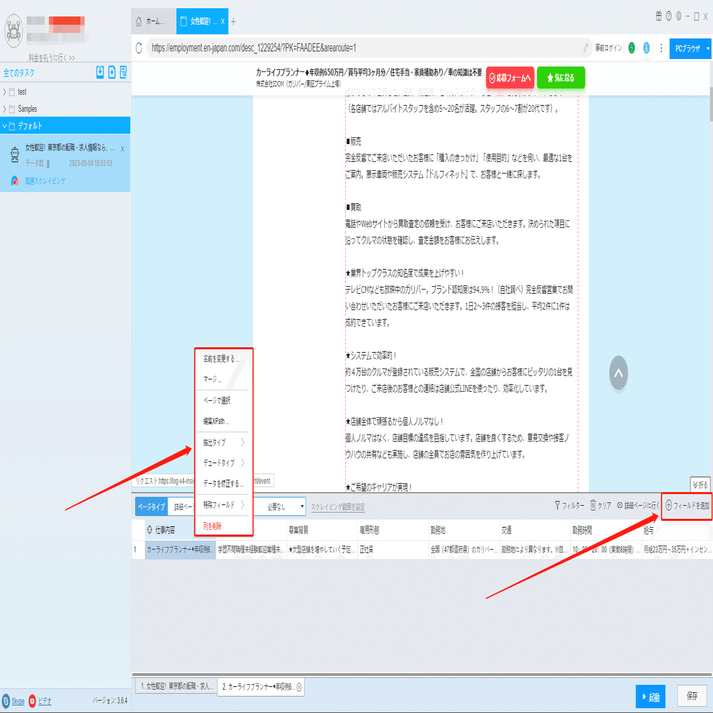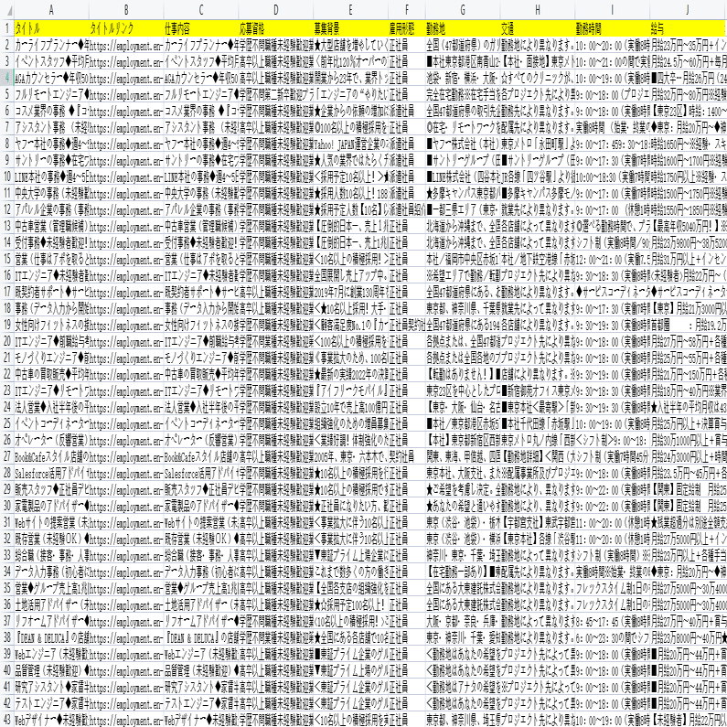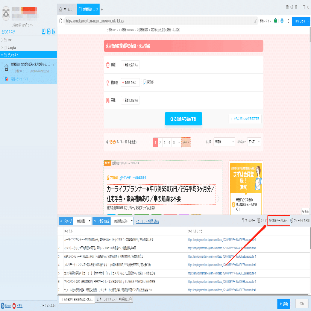 仕事内容、待遇、休日休暇、給与などの詳細情報は詳細ページに付いていますから、ソフトウェアの「詳細ページに行く」機能を利用して、データを抽出します。