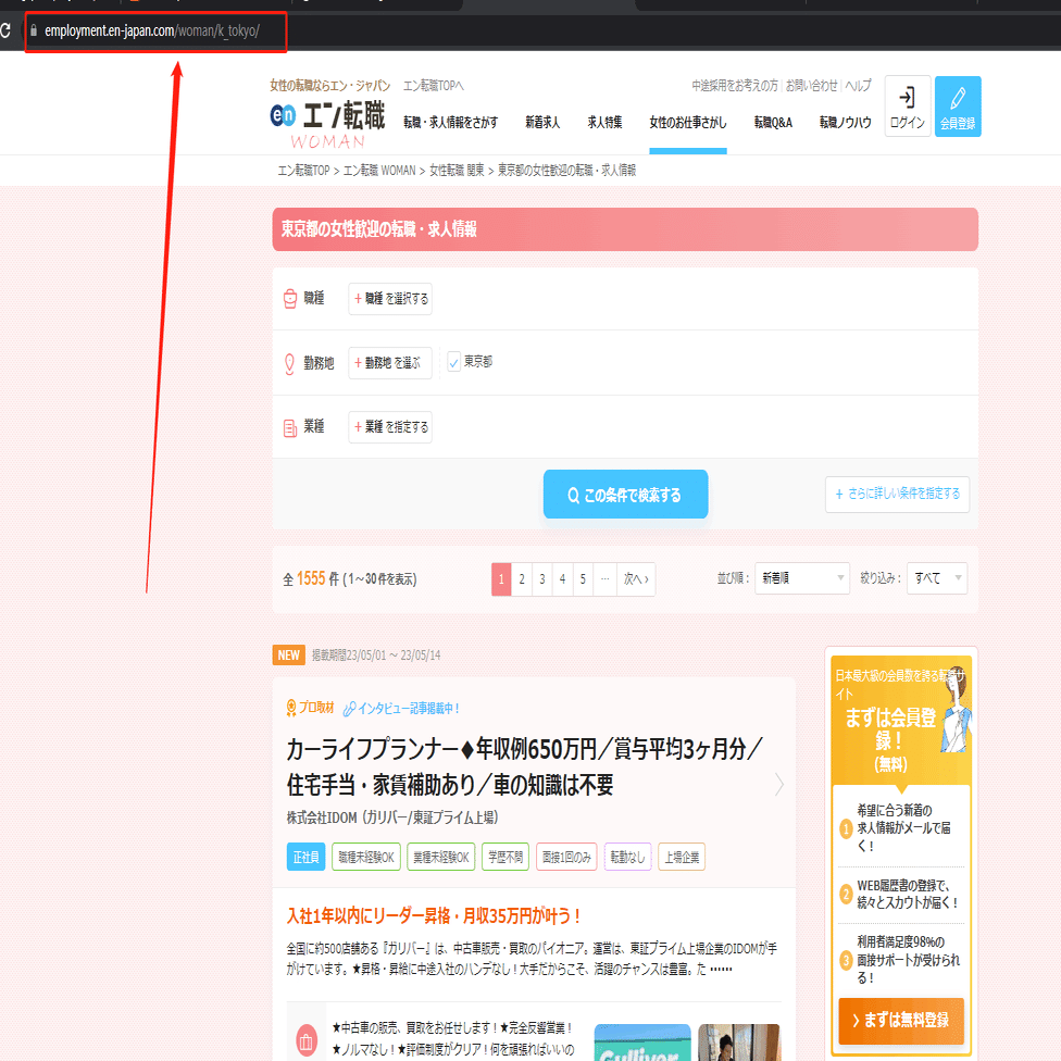 今回は東京都の女性歓迎の転職・求人情報一覧ページを例として、スクレイピング方法を紹介します。まず、URLをコピーしてください。
