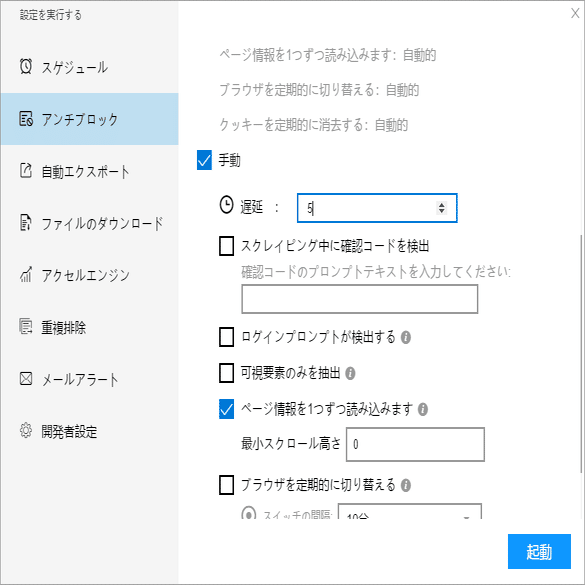 必要に応じて、スケジュール、アンチブロック、自動エクスポート、写真のダウンロード、スピードブーストを設定できます。サーバーに負荷しないように、遅延時間を設定してください。5秒以上を推薦します。スクレイピングタスクを配置する方法については、下記のチュートリアルをご参照ください。