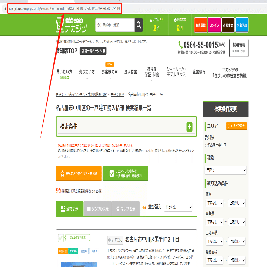 今回は名古屋市中川区の一戸建て購入情報 検索結果一覧ページを例として、スクレイピング方法を紹介します。まず、URLをコピーしてください。