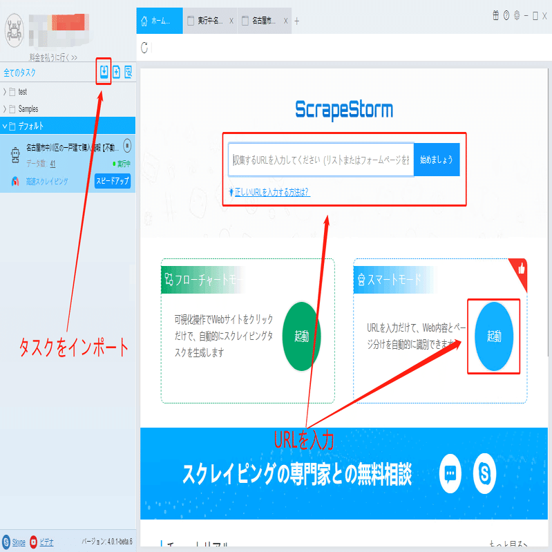 ScrapeStormのホムページ画面にスマートモードタスクを新規作成します。また、持っているタスクをインポートすることもできます。
