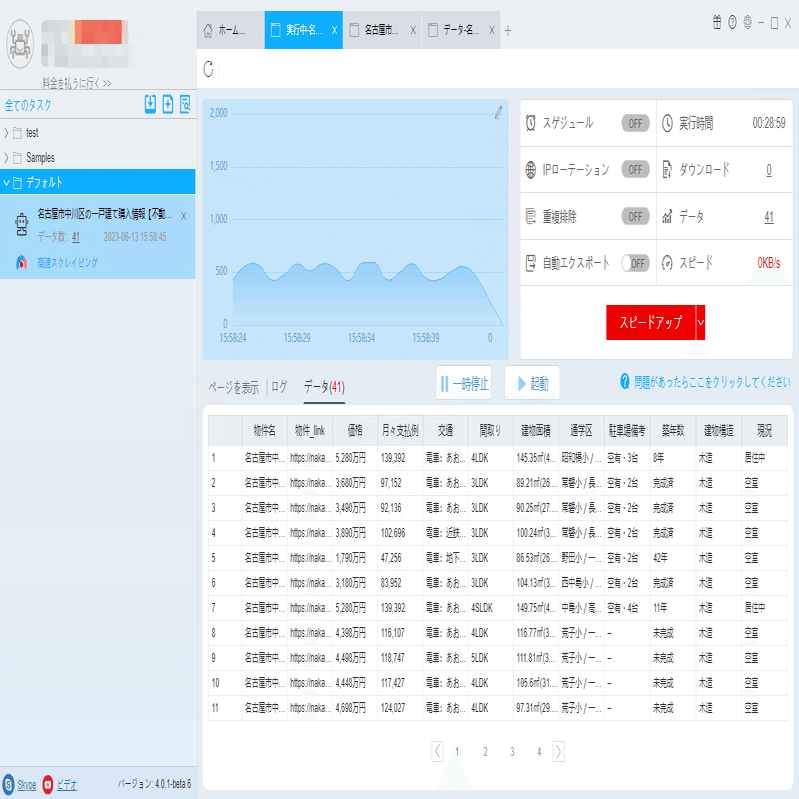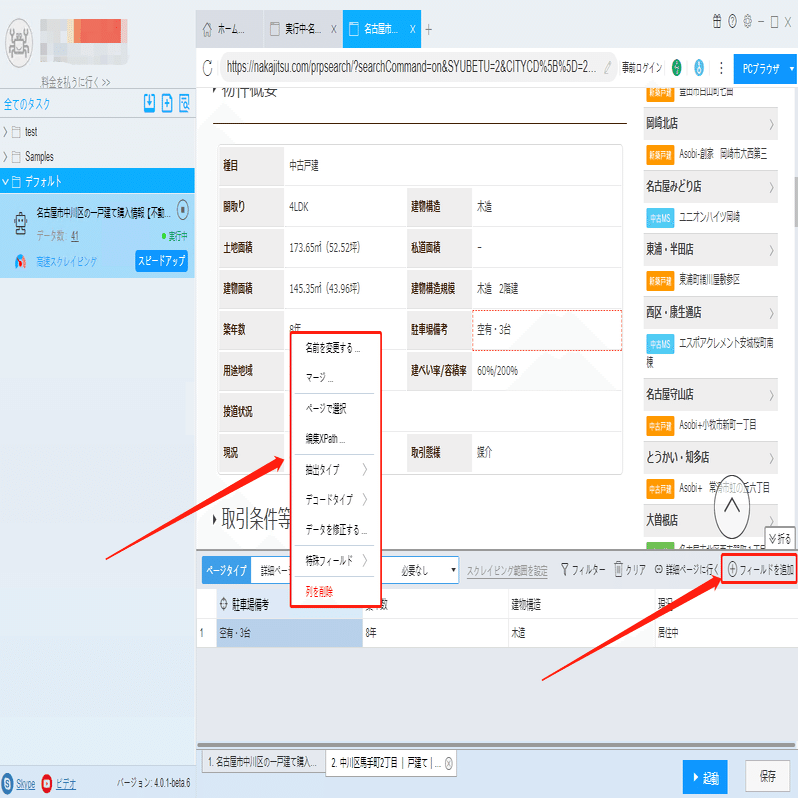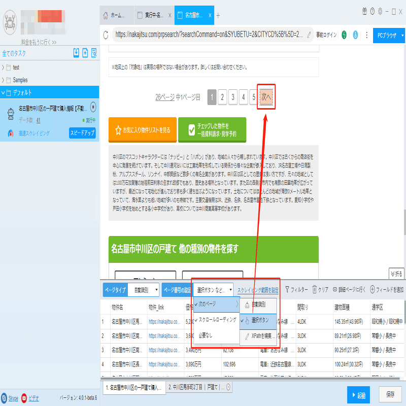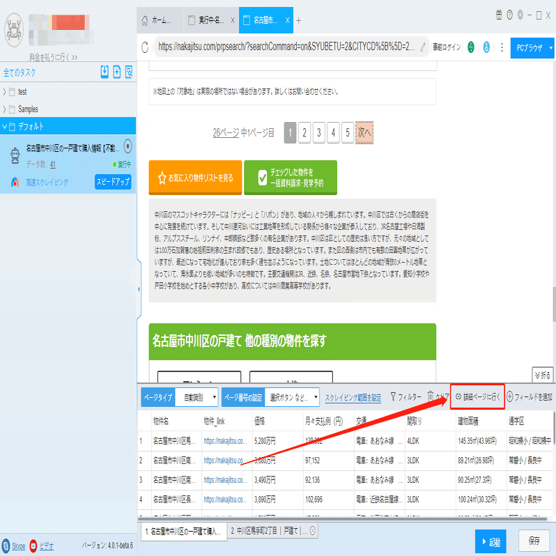 築年数、現況、駐車場などの詳細情報は詳細ページに付いていますから、ソフトウェアの「詳細ページに行く」機能を利用して、データを抽出します。