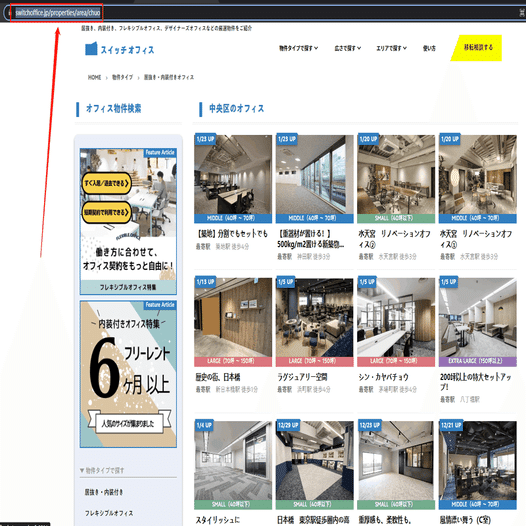 今回は中央区のオフィス一覧ページを例として、スクレイピング方法を紹介します。まず、URLをコピーしてください。